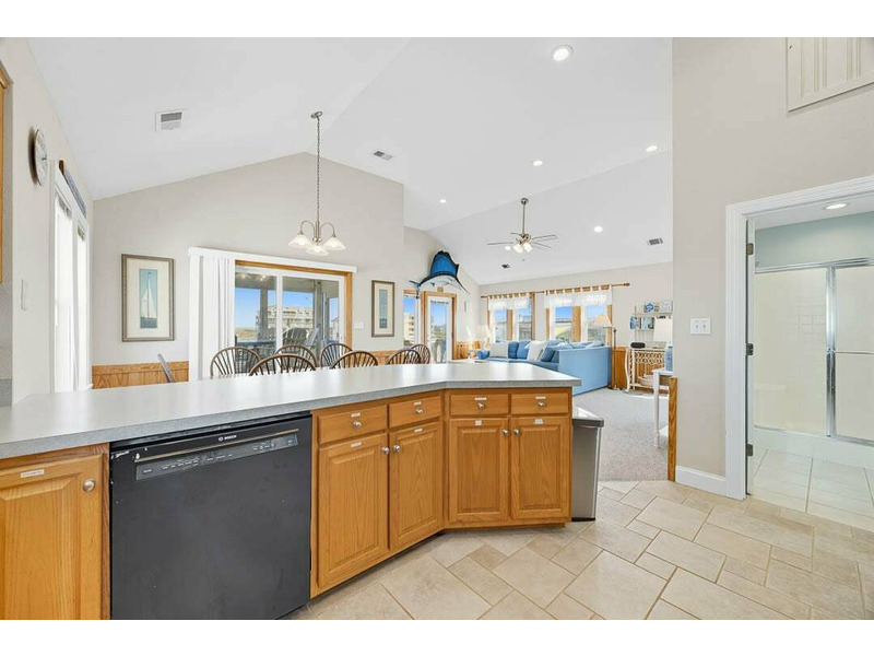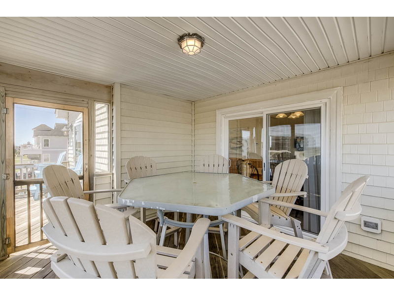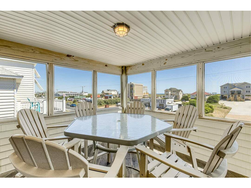 - Top-Level: Partial ocean views from the front deck, an open kitchen with a large bar, dining table, and living area, plus a screened porch with seating for six.