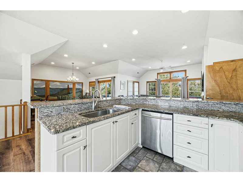 Top-Level: Living Room with Smart TV and Deck Access; Dining Room with Table (seats 10) and Deck Access; Kitchen with Bar (seats 4), Blender, Coffee Maker (Drip & Keurig), Dishwasher, Microwave, Oven/Stove, Refrigerator, Toaster, Pots, Pans, Dishes, and Cooking Essentials; Hall Half Bathroom.