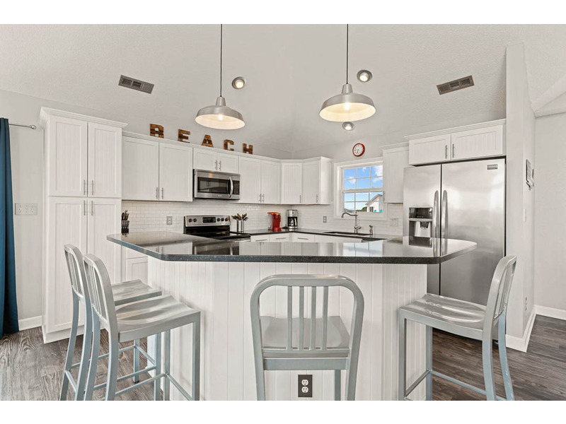 On the ground-level, all ages can relax over a game of billiards, cards, board games, or a movie, and there are plenty of new smart TVs and DVD players throughout this gorgeous home. Or you can fix some poolside snacks at the rec room kitchenette before stepping out the sliding glass door to the pool deck, where you will find a large pool and hot tub. Interested in a bit of competition? Fiddlin' Around also features a basketball goal, sand tetherball court, and sand volleyball court to test your serves against your friends and family. There are two grills (gas and charcoal) along with a sandbox for the little ones (and an outdoor shower if they need to rinse off). When the sun sets, enjoy a view of the colorful clouds and emerging stars from the top-level deck.