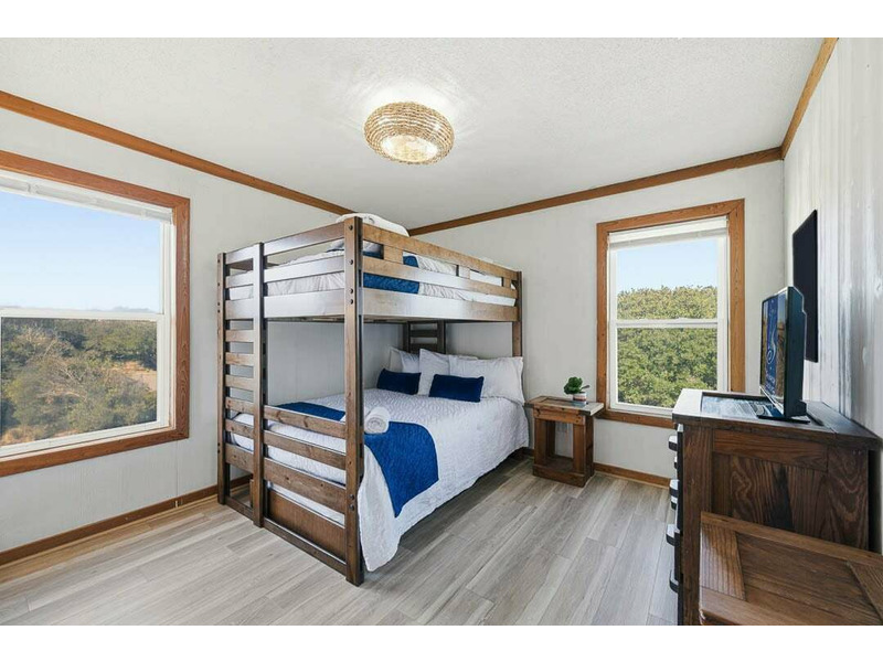 Main-Level: Living Room with Smart TV and Deck Access; Dining Room with Table (seats 6); Kitchen with Blender, Coffee Maker (Drip & Keurig), Dishwasher, Microwave, Oven/Stove, Refrigerator, Toaster, Pots, Pans, Dishes, and Cooking Essentials; Queen Bedroom; Queen Bedroom; Bedroom with Bunk Bed (Double over Double); Hall Full Bathroom; Hall Full Bathroom; Laundry Closet.
