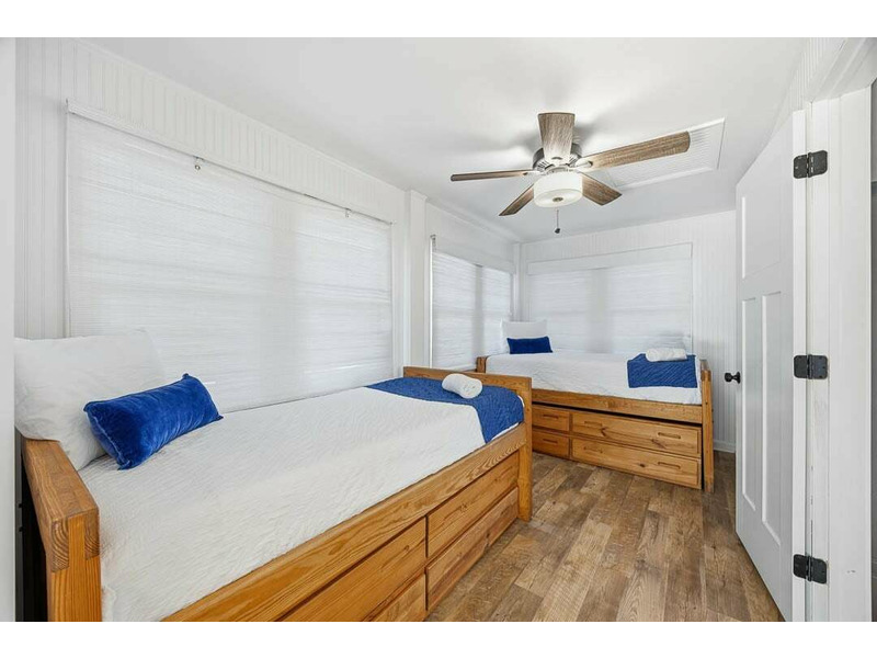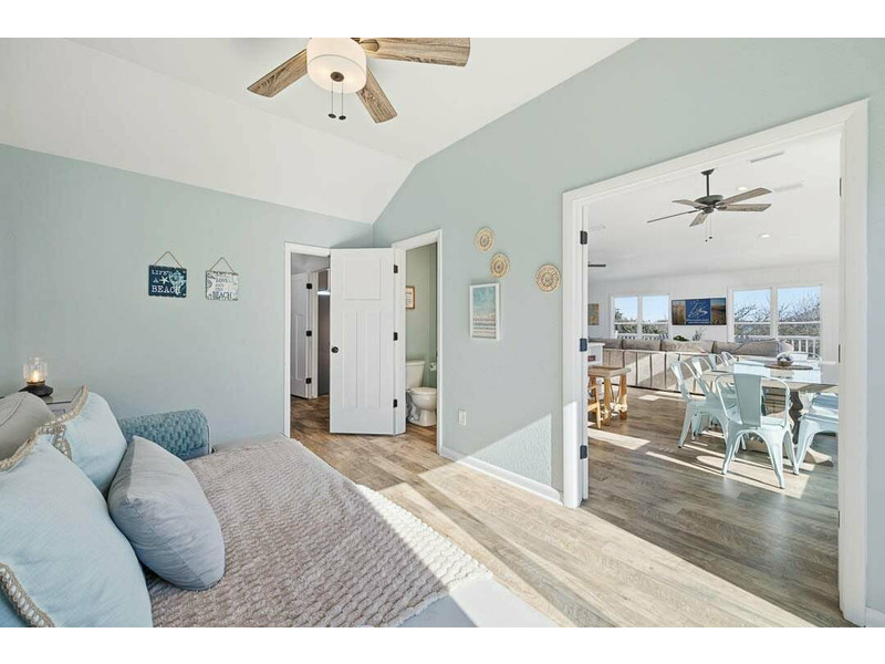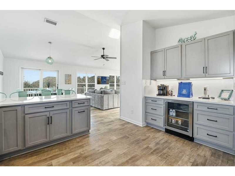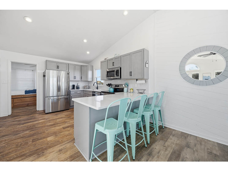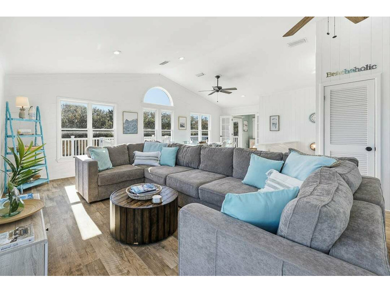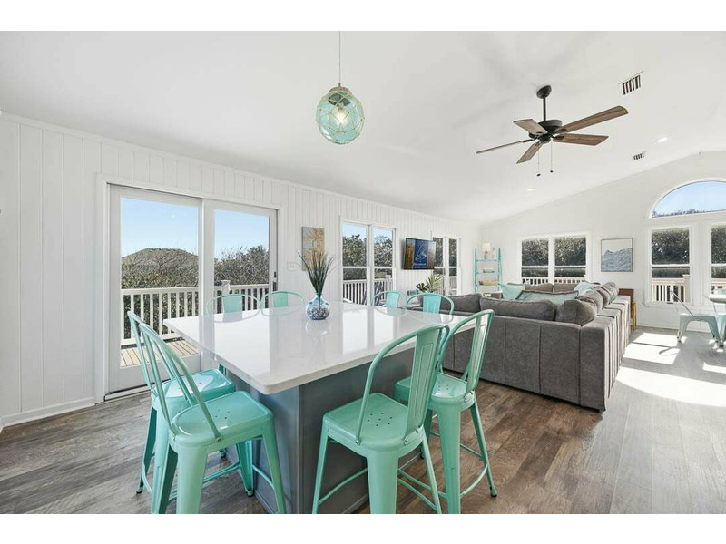 An elevated coastal chic ambience invites you to explore each level. At the top, you'll find a series of spaces for the family to spread out: an open kitchen with marble countertops, a bar, and plenty of cabinetry, a dining room for everyone to gather in at supper, a living room with a large U-shaped sectional sofa and additional dinner seating, a den with deck access, and a bedroom with 2 twins.