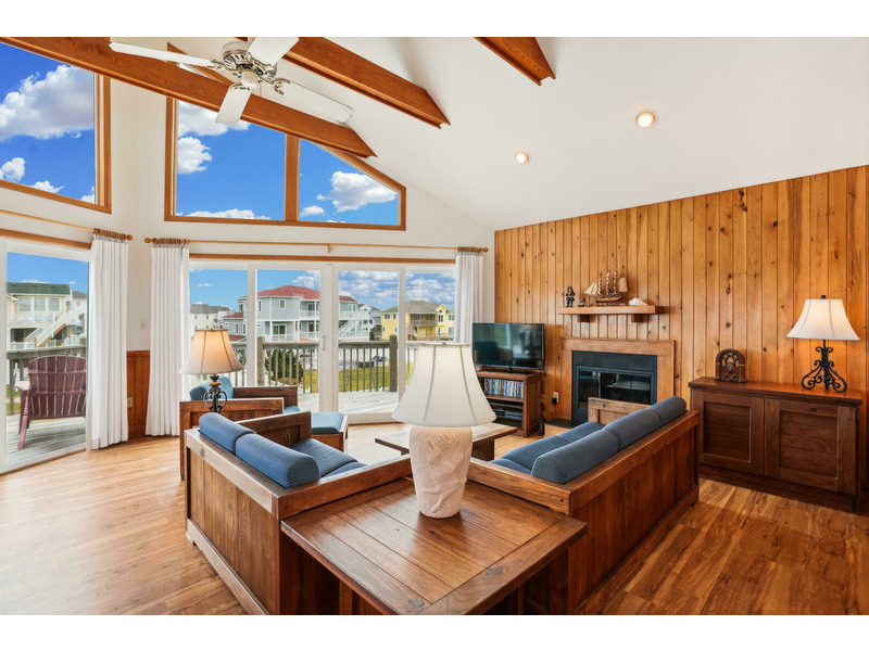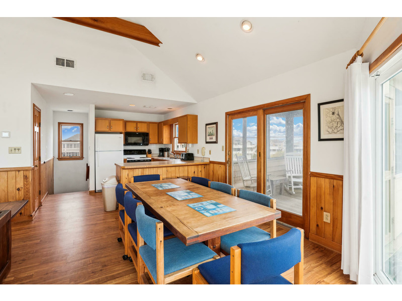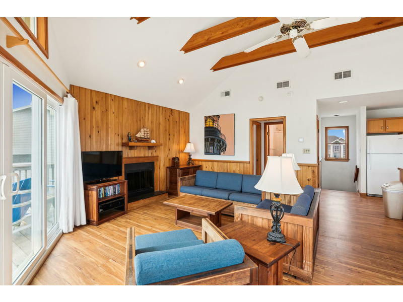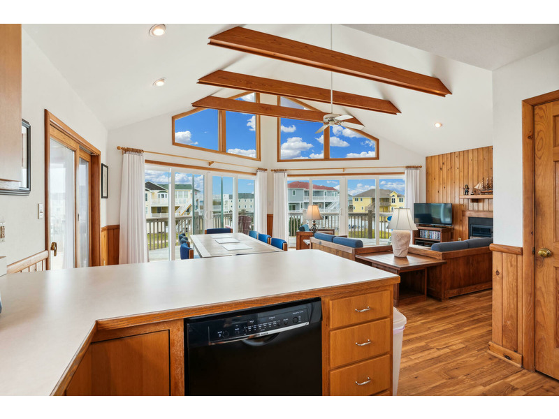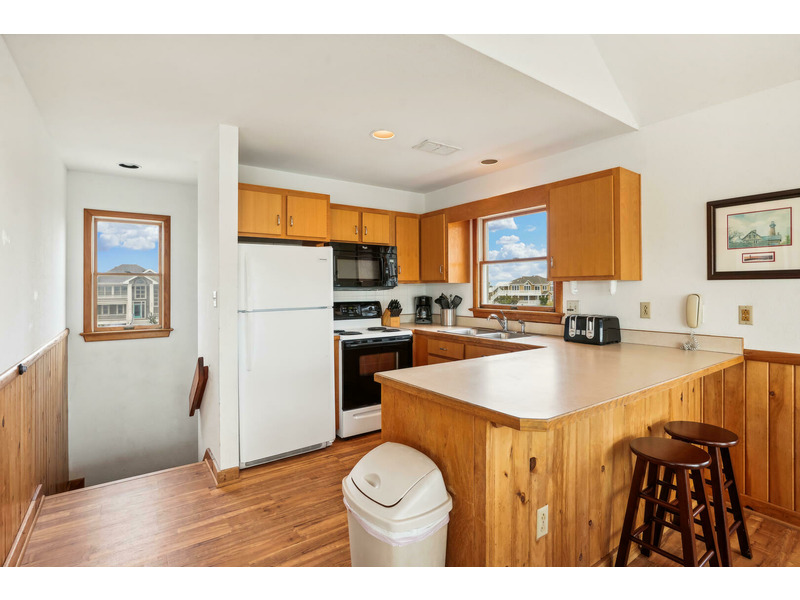 The full kitchen features a breakfast bar as well as a microwave, dishwasher, and refrigerator with icemaker. A washer and dryer are available for keeping beach towels and bathing suits clean and dry during your vacation. Ceiling fans as well as central air and heat will keep everyone cool and comfortable even on the hottest summer days and the wood burning fireplace will keep Guests warm and toasty in the Off Season.