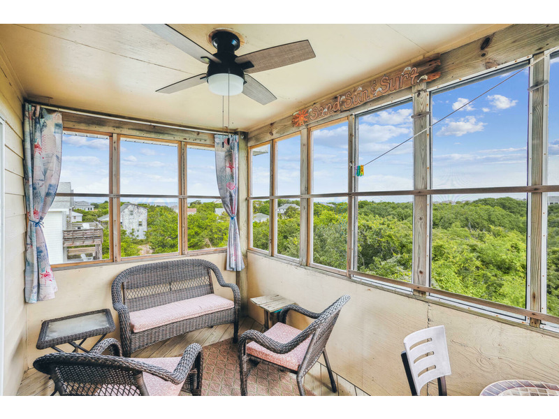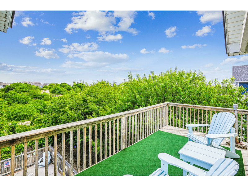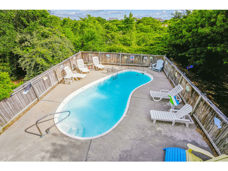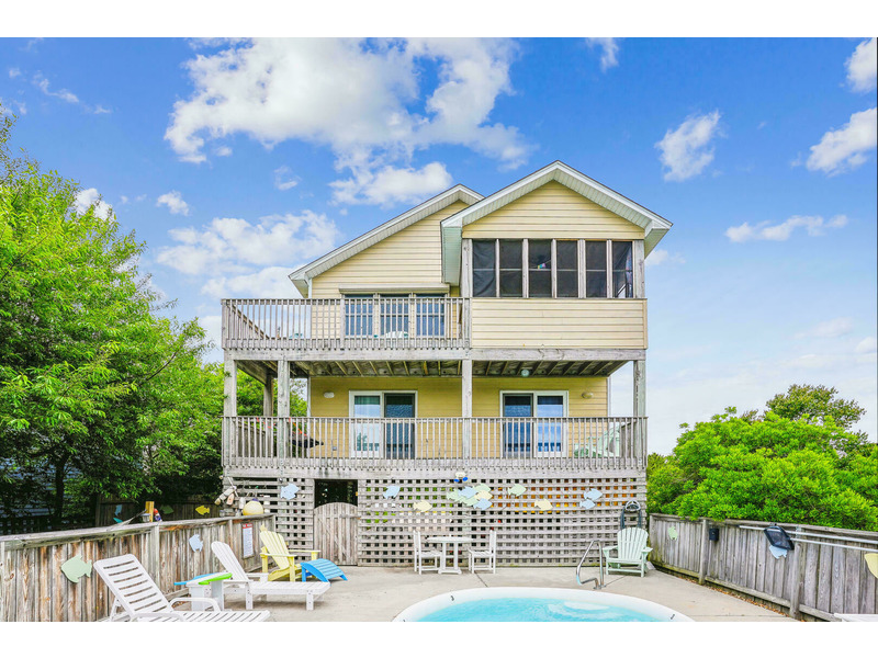 New exterior sitting area with TVComfortably accommodating 9 people, "Duck Views" has 4 bedrooms and three bathrooms. Don't worry about packing up a full car to drive to the beach... you and your family/friends will love the quick 1100 foot skip to the beach and direct beach access! Convenient washer/dryer on the bottom floor will keep you from packing so many clothes and will allow you to return home with clean laundry. Splash around in your Private Pool after a long day on the beach, clean the fish you caught in the water's edge on the outdoor fish cleaning table, and then grill it on the charcoal grill. Pool available 5/7-10/8.
