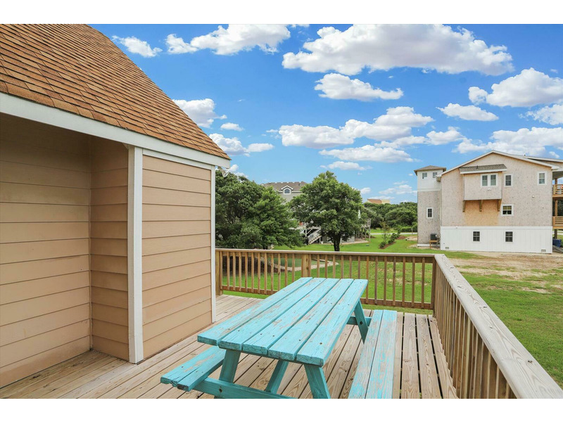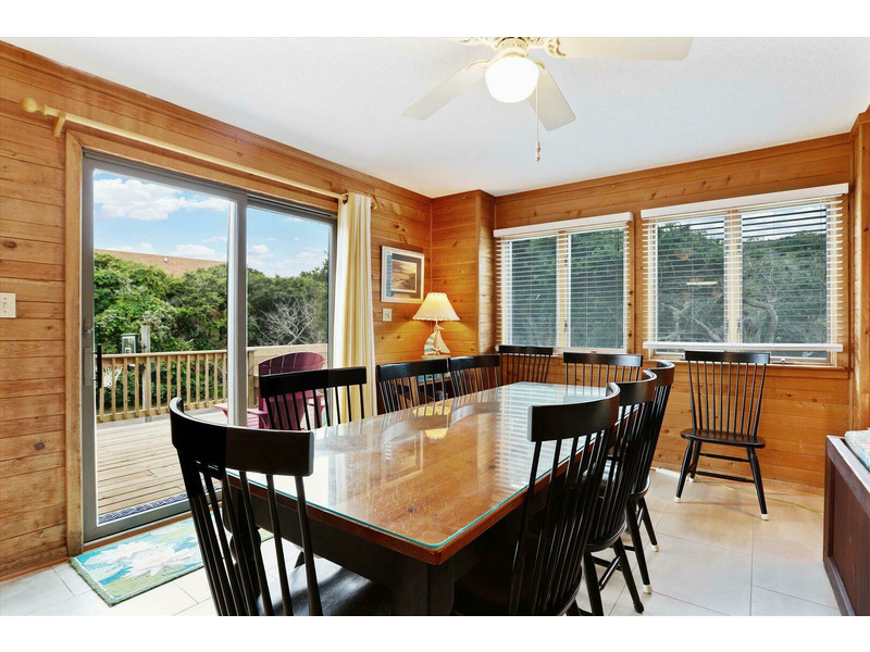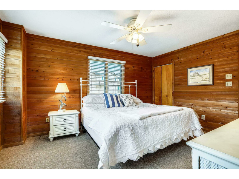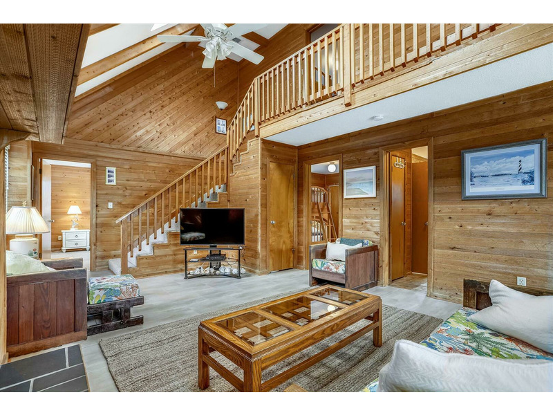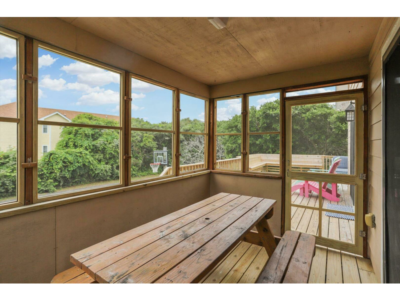 Tides Drive is a quiet, private road with direct beach access featuring a boardwalk with bench seats for use by Tides Drive guests only. It's a short walk to the beach - less than 600 feet (200 yards) - and Timberland is located on the 4th lot back from the ocean. Made of juniper wood from the Currituck mainland, Timberland's interior is well maintained with a bright and open feel. Featuring large open decks and a screened porch with a picnic table, this vacation home is designed with families in mind. A basketball goal in the driveway and horseshoes in the backyard invite outdoor play, while the short walk to the beach makes it easy to go swimming, surfing, and beachcombing. After a dip in the ocean, rinse off the salt and sand in the enclosed outside shower. The fisherman in the family will appreciate the fish cleaning table, and the under-house storage area has plenty of room for beach chairs, fishing poles, sand toys, boogie boards, and more.