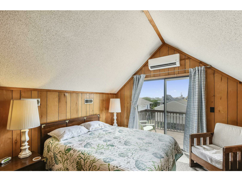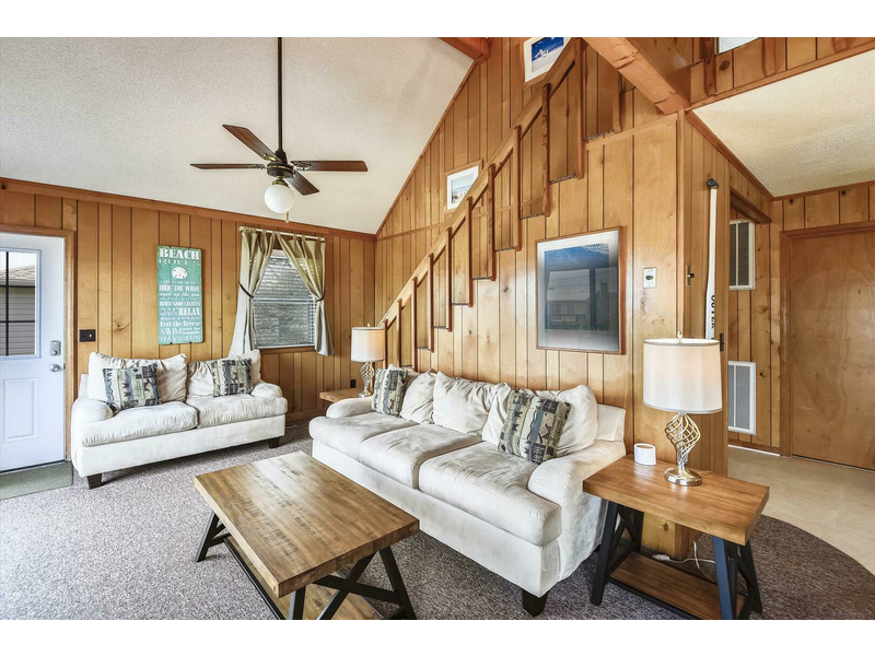 This cozy beach retreat offers a warm interior featuring a spacious living area perfect for unwinding after a sun-kissed day. The glass sliding doors open to a welcoming deck, inviting you to enjoy the coastal breezes or dine under the open sky.