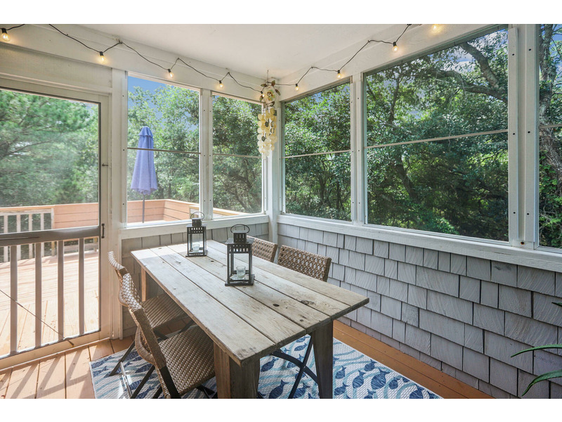 - Top Level: Living Area, Kitchen with breakfast bar, Dining Area, Screened Porch with Picnic Table