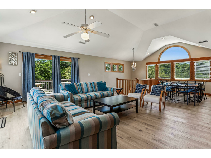 - Top Level: Open Living Area, Dining area for 12-16, Kitchen with stainless steel fridge with ice maker, Dishwasher, and over the stove microwave, Powder Room Bath, King Master with whirlpool tub and stand alone shower. Open sun decks.