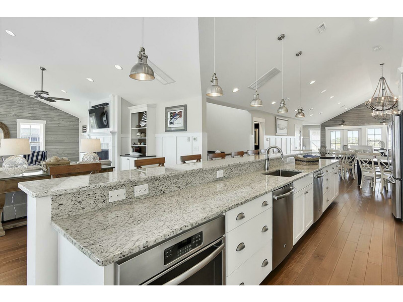 The entertainment possibilities are endless on the "orlop deck," or the ground floor. Play a friendly game of pool while the rest of the crew watches from the custom Stern Bar in the rec room, which also offers multiple flat screen TVs, a poker table, and a sitting area. This lower level Stern Bar/kitchenette features a full-size refrigerator, commercial ice maker, blenders, microwave, coffee pot, and a kegerator with tap, helping to ensure that snacks and beverages are within reach at all times. A dishwasher is also included for easy cleanup. Screen the latest flicks on the big screen in the adjacent theater room, which offers Apple TV, a large flat screen, and tiered seating. Play an exciting game of Golden Tee or Whac-A-Mole in the arcade; for the fans of old school games, there is classic Dome Hockey. Stay on track with a workout in the exercise room, which offers an elliptical, treadmill, and an array of medicine balls. Also included on the lower level are a sitting area, a half bathroom and a laundry room. Bedding on this level includes 2 king master suites, and a third master bedroom with two built-in pyramid bunksets.