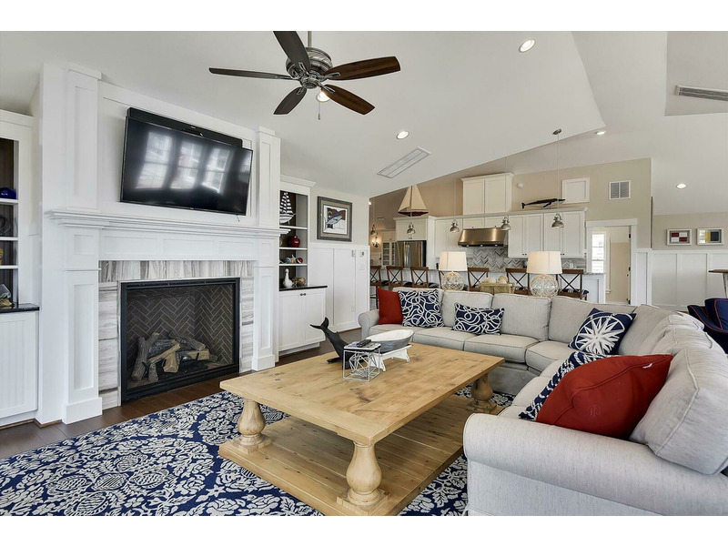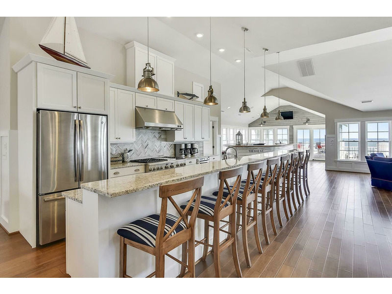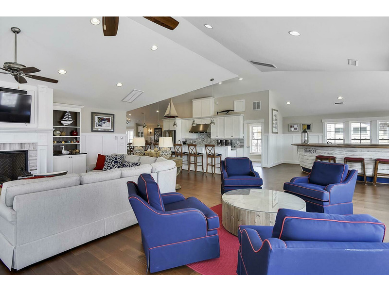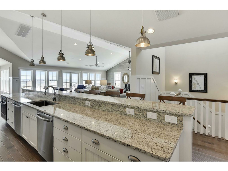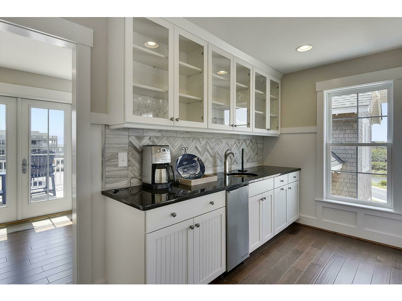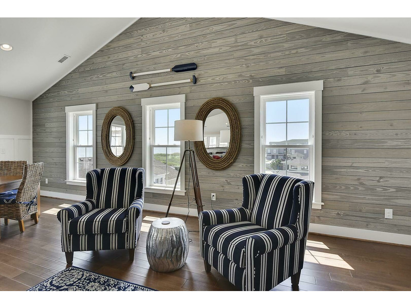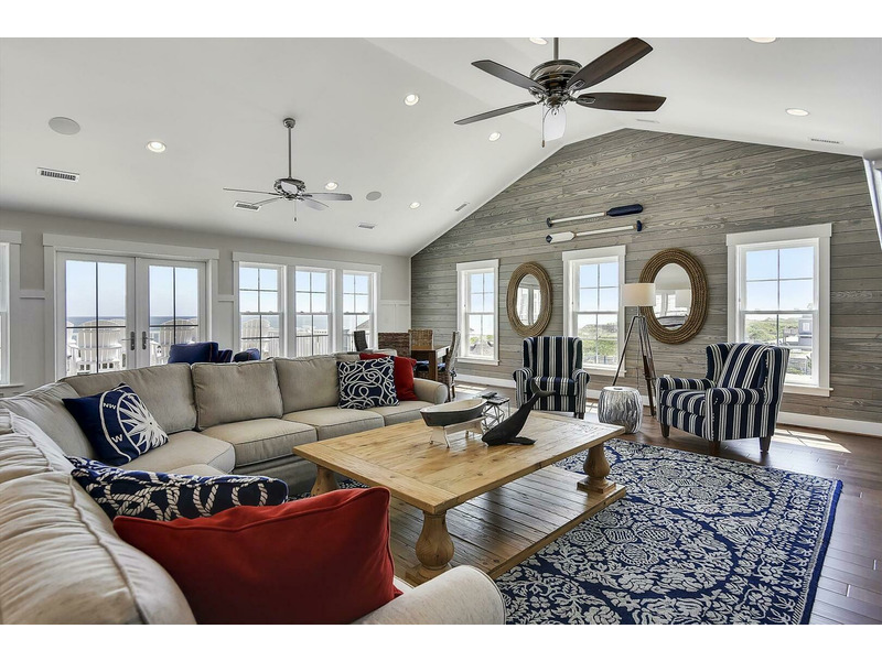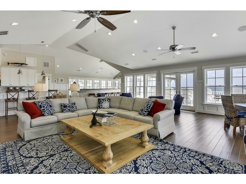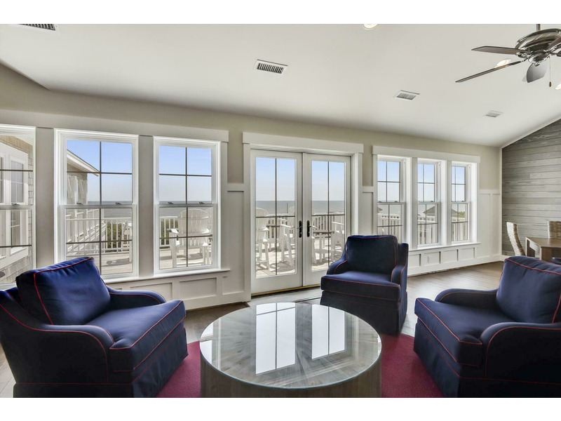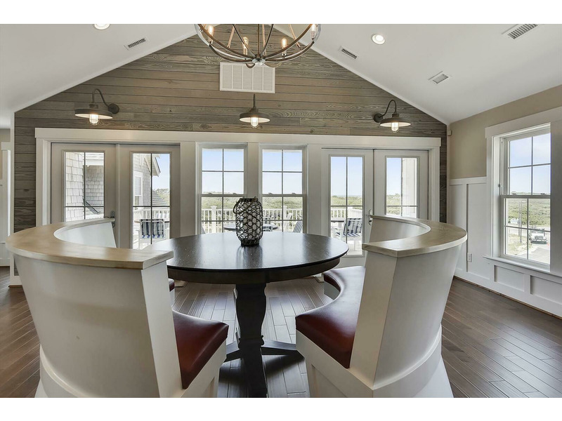 Crew Quarters boasts a light and airy great room designed to accommodate the entire crew on the "top deck." This bright and open room consists of the comfortable living area, fantastically appointed "galley" with large pantry, formal dining areas, and the completely unique "Bar-ge", a full bar housed inside an original replica life saving station boat. High-quality outdoor furniture on the surf-watch oceanview deck ensures your crew's comfort and brings the nautical theme outdoors. You can keep watch on the horizon from the spacious, partially covered surf-watch deck -- a scenic and comfortable post overlooking the Atlantic, especially during stormy seas. The sunrise on the surf-watch deck is amazing. If the sunrise is a little too early for your voyage, the ever enticing sunset on the sound side view is sure to compare. You can literally see both the ocean and sound from the "top deck" at Crew Quarters - without moving. The dining area has a variety of seating options, including a one-of-a-kind circular banquette that is sure to be a favorite of the littlest crew members. Rounding out the "top deck" are four generous master suites for the Captain and Lead Decks of your crew - three are kings, one is a queen. For your convenience, Premium quality linens and bed making service is provided for all arriving guests.