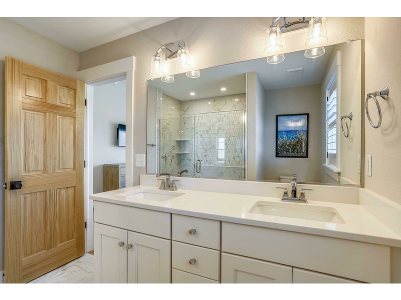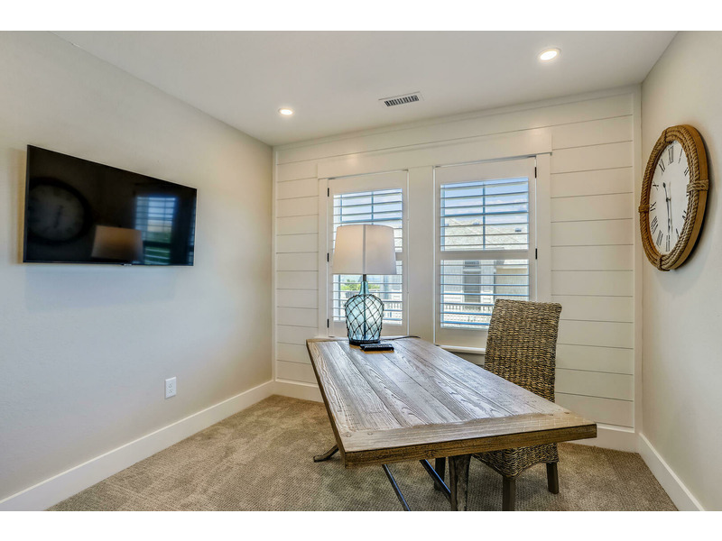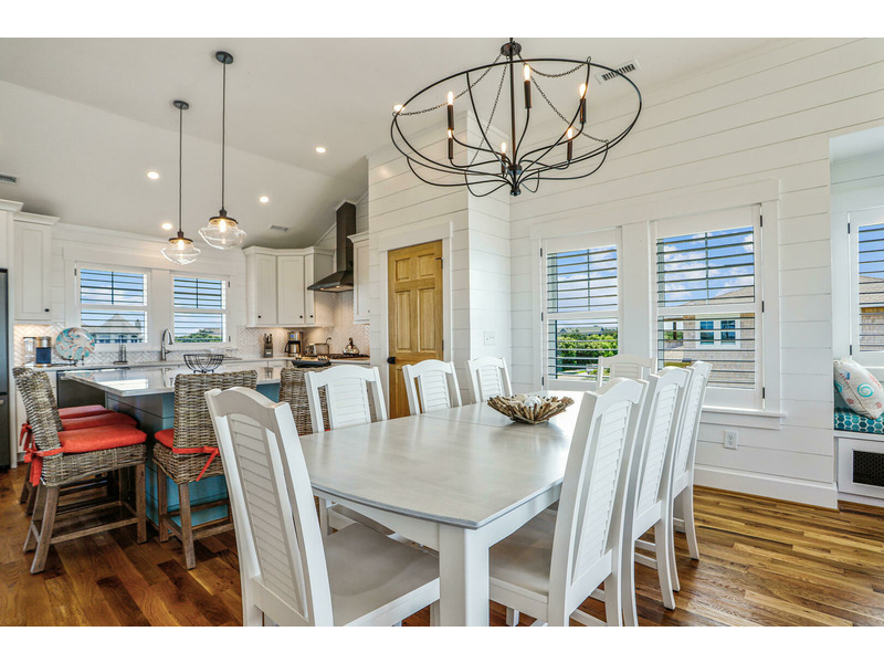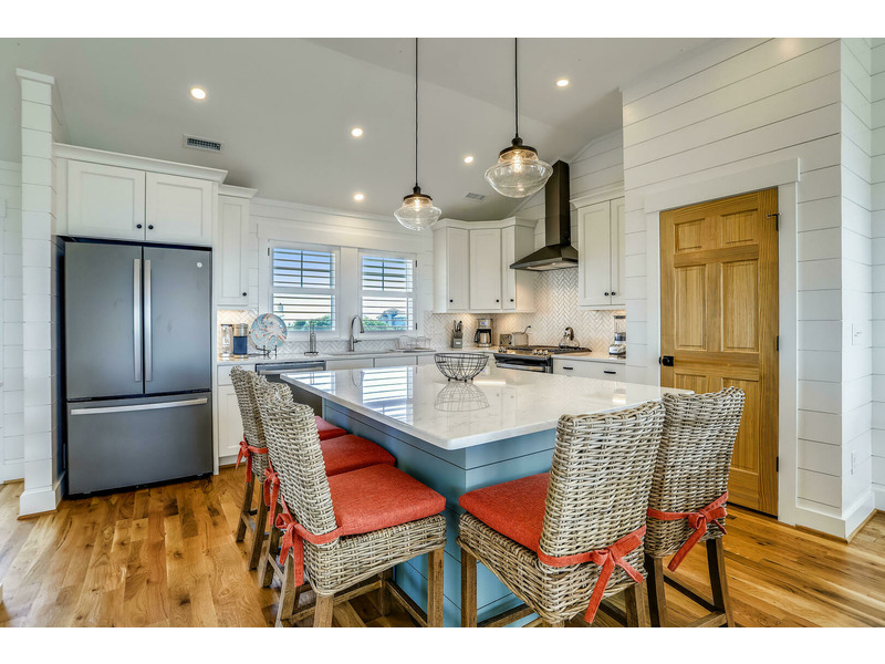 Step into a gourmet kitchen that exudes modern luxury with a touch of coastal charm. Pristine white countertops, paired with state-of-the-art appliances, invite you to whip up delicious meals with ease. Delight in the elegant herringbone backsplash, which complements the gleaming pendant lights above. Rich wooden flooring leads you to a cozy breakfast nook, adorned with woven bar stools and a pop of ocean blue. As sunlight filters through the stylish shutters, imagine sipping your morning coffee in this radiant space. It's a kitchen designed not just for cooking, but for creating unforgettable vacation memories.