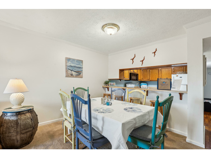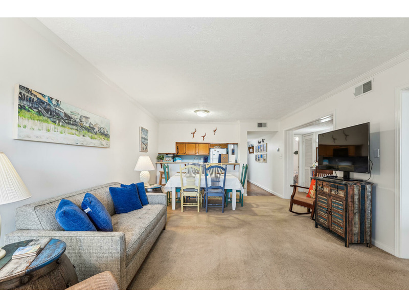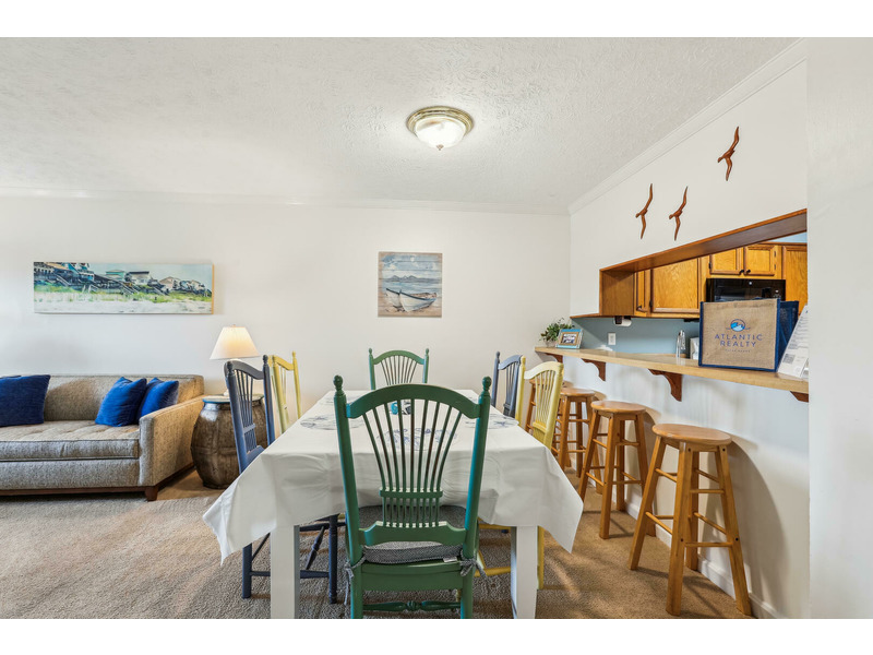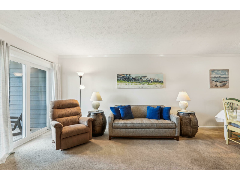 It's light-filled dining area and a comfortable living space. The wooden dining table set for four stands ready for shared meals and memories, while the adjoining living area provides a soft sofa and a reclining chair, perfect for relaxing after a day at the beach. Natural light streams through the sliding glass doors, leading to a porch that promises fresh ocean breezes. The decor is simple yet warm, featuring a calming palette that echoes the sandy shores nearby. This charming first-floor condo ensures easy access to the outdoors, inviting guests to enjoy the coastal lifestyle Duck Blind Villas is known for.