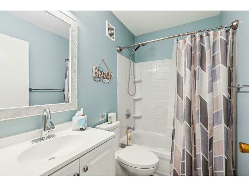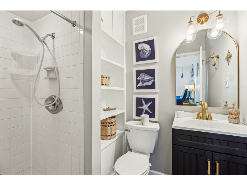 Not to be overlooked, the newly remodeled bathrooms at 733 Heavens Nest offer a fresh and modern touch to the oceanfront condo. With its pristine white fixtures, including spacious vanities and bright lighting, the spaces feel clean and rejuvenated. Nautical-themed artwork adorns the walls, accentuating the marine vibe of the condo. Shelving units provide ample storage for beach towels and toiletries, keeping the area uncluttered. The bathrooms, with their thoughtful touches and updates, contribute to a comfortable and hassle-free stay at Heaven's Nest, ensuring that guests feel refreshed and at ease during their seaside escape.
