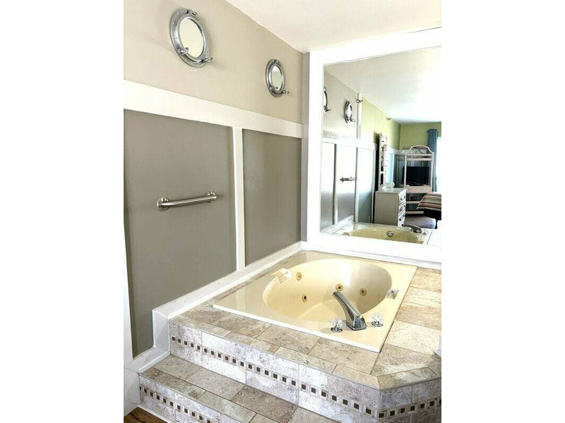 - Primary bedroom with Queen Bed, flat screen TV, Jacuzzi tub
