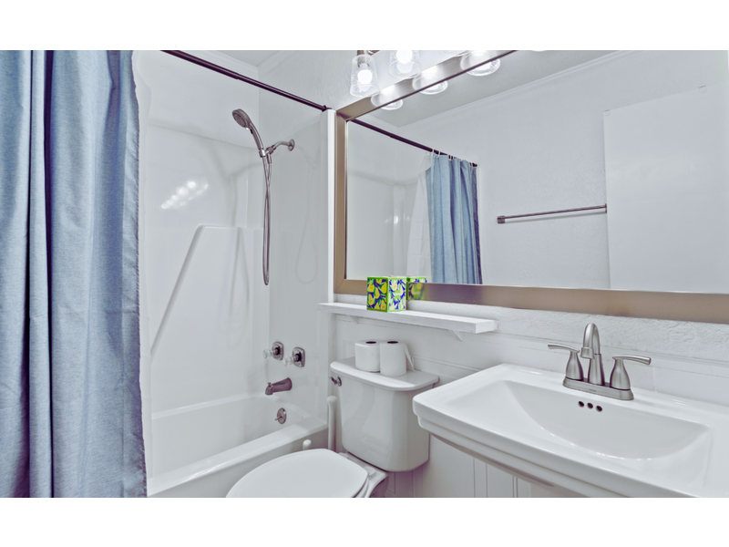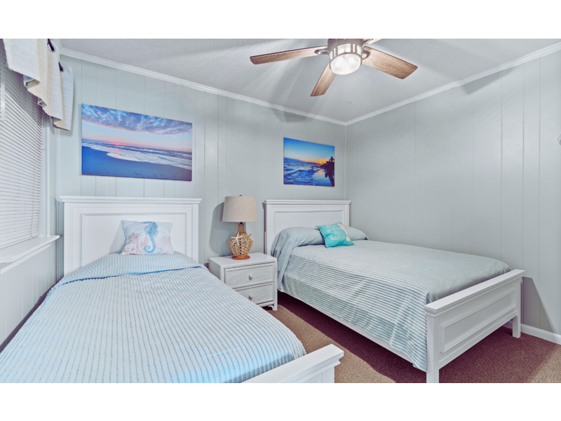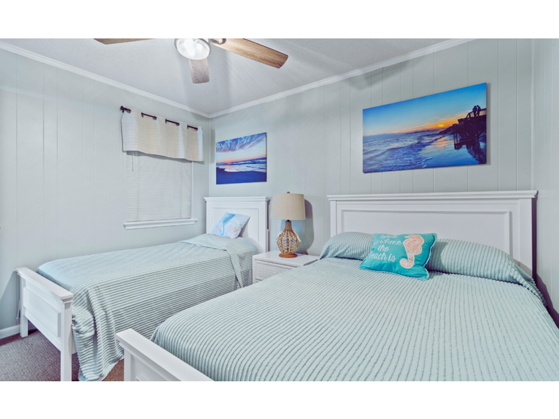 - Bedroom with twin and full bed, ceiling fan, closet, and wicker armoire and nightstand, hall bathroom with tub/shower combo