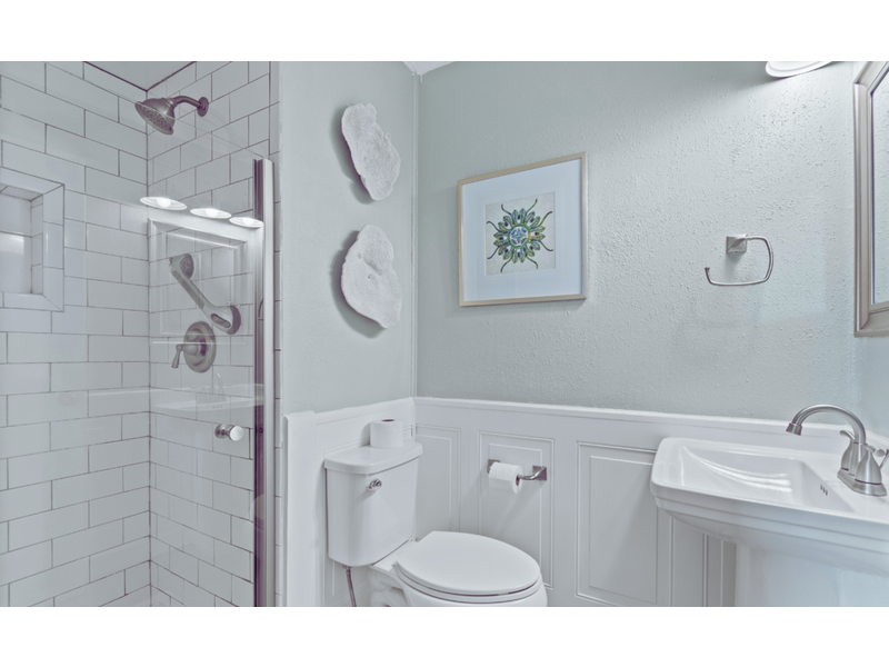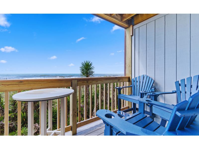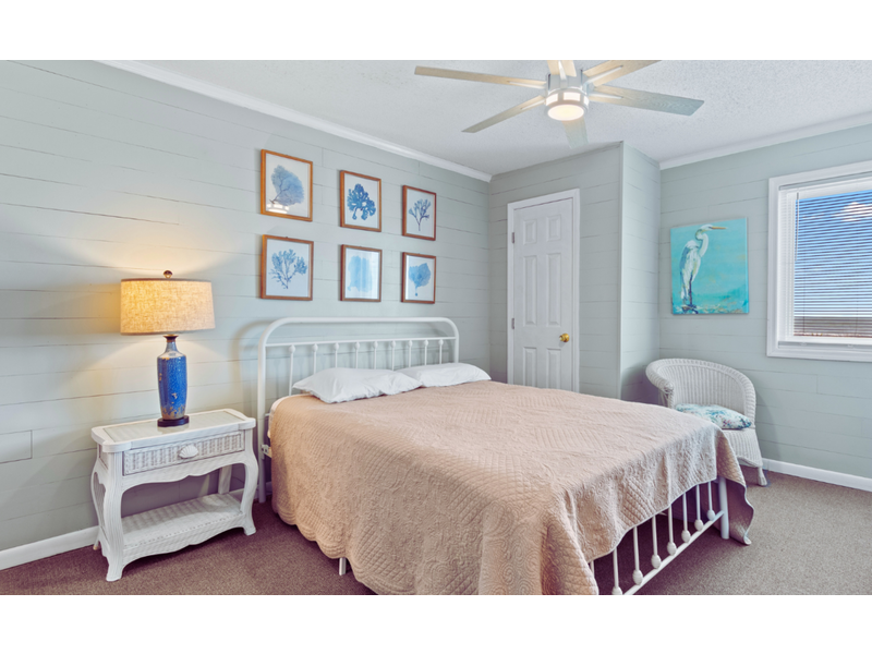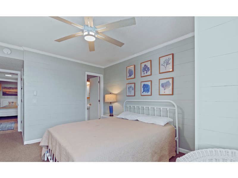 - Oceanfront Master bedroom with a Queen bed, ceiling fan, closet, wicker dresser and nightstand, mounted flat screen TV, ensuite bathroom with standup shower.