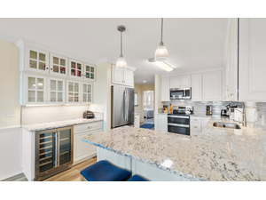 - Living and Dining area are open and room for large families. The living room has a large flat screen TV with a sound bar and plenty of seating. The kitchen is modern and well equipped for grand meal preparation and entertaining to include a wine cooler, wet bar, double oven, and Keurig.