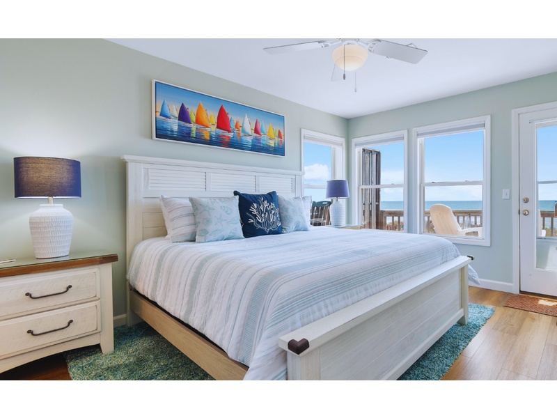 - 1 bedroom with 1 bunk bed and 2 twins, ceiling fan and ocean side balcony.