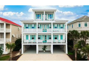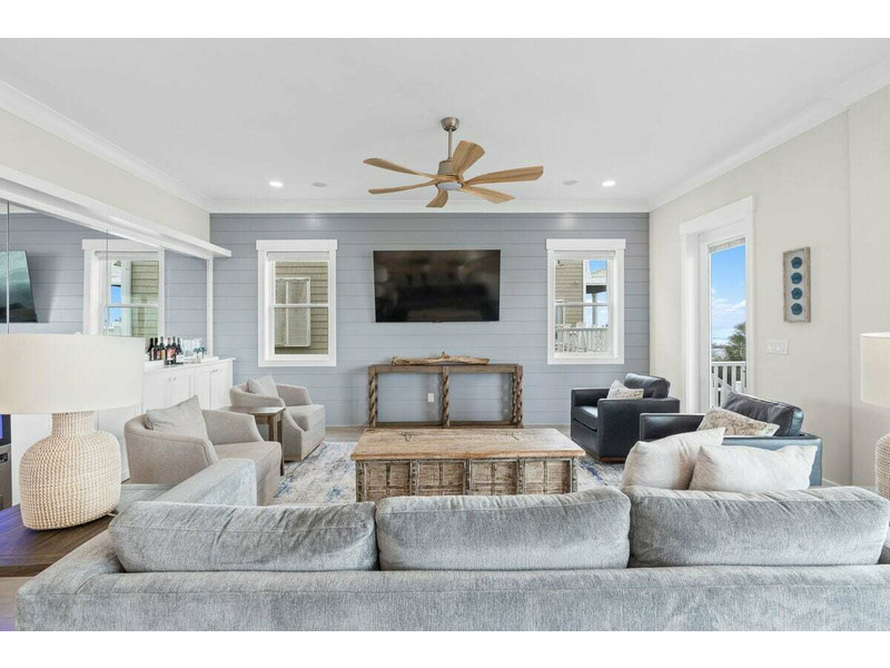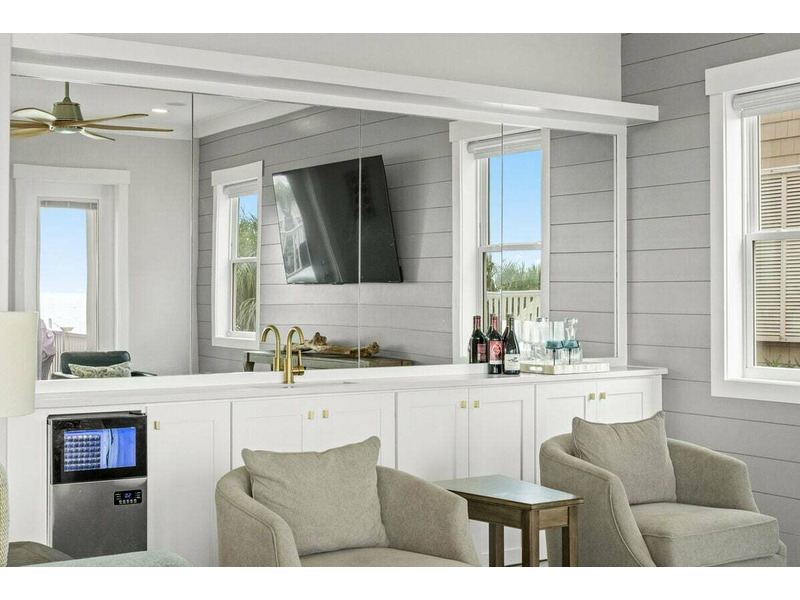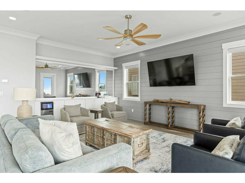 Oceanfront living area: professional kitchen with premium equipment including two refrigerators, one full-size freezer, two sinks, two ovens, a 6-burner stove, and pantry; beverage station with an ice maker, 2 coffee makers, 1 Keurig; living room with 75" Smart TV and Sonos; board games. A large sliding door opens up on the expansive furnished oceanfront deck. There is a half bath on this floor and a laundry room.
