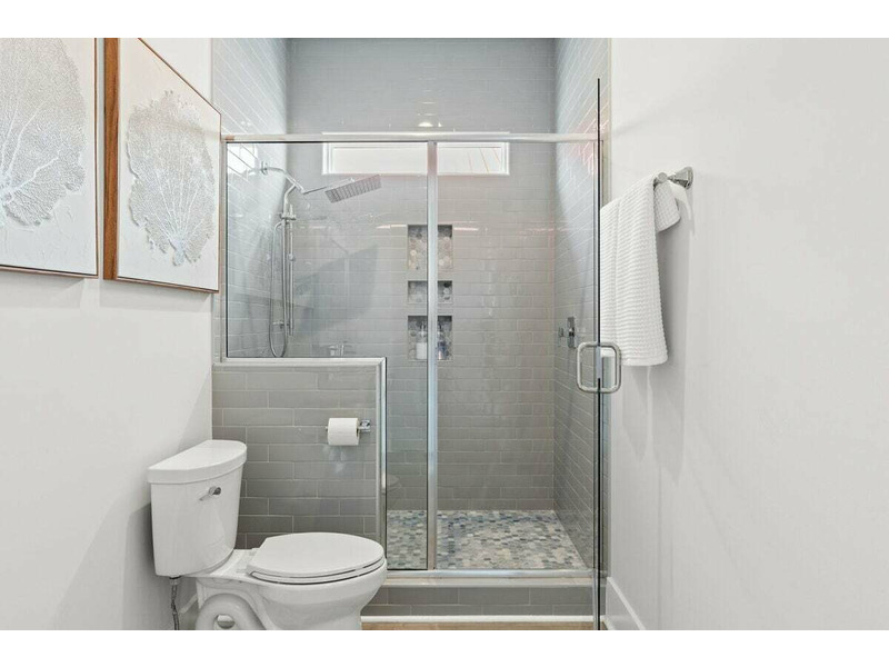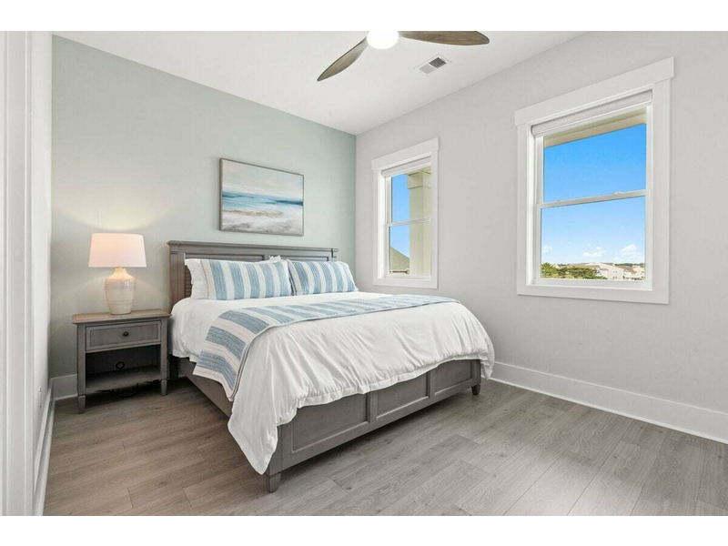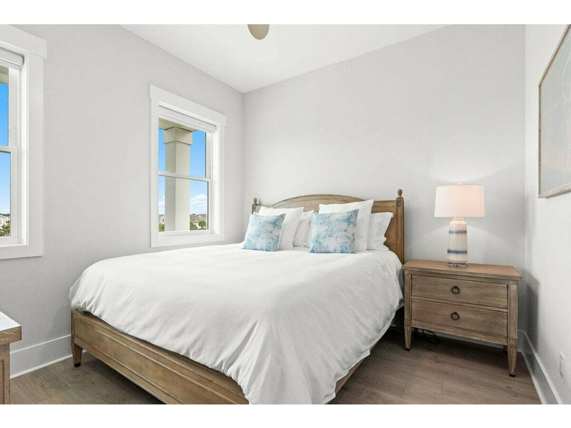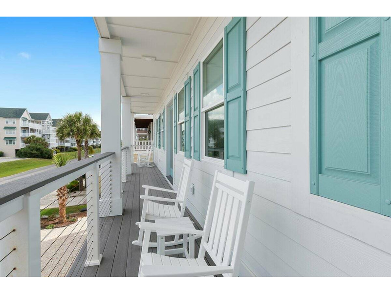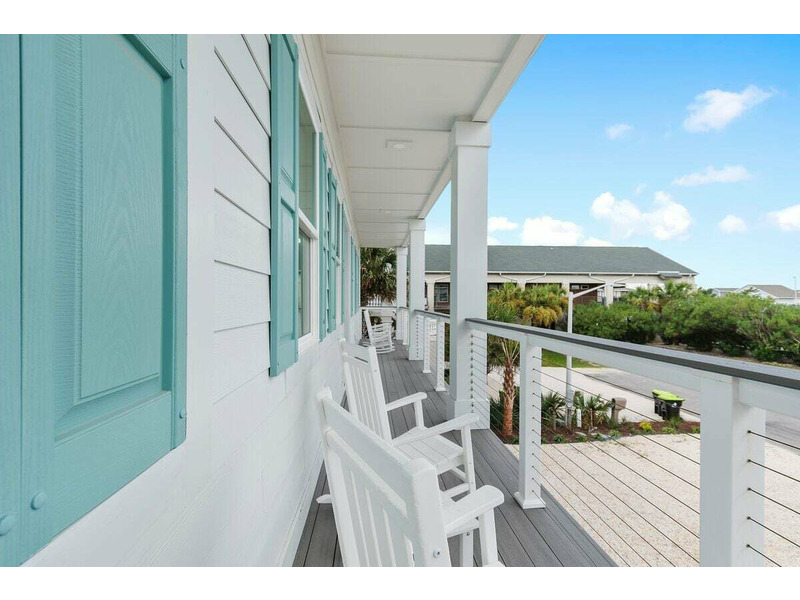 Room 3: 1 Bunk bed (3 stacked twins) + 2 Queens; ensuite with tub/shower and double sinks; streetside covered porch