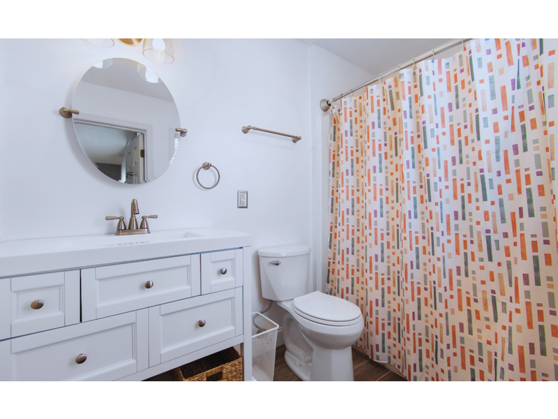 - Primary bedroom with 1 king bed, wall mounted flat screen TV, ceiling fan and full private bathroom with standup shower