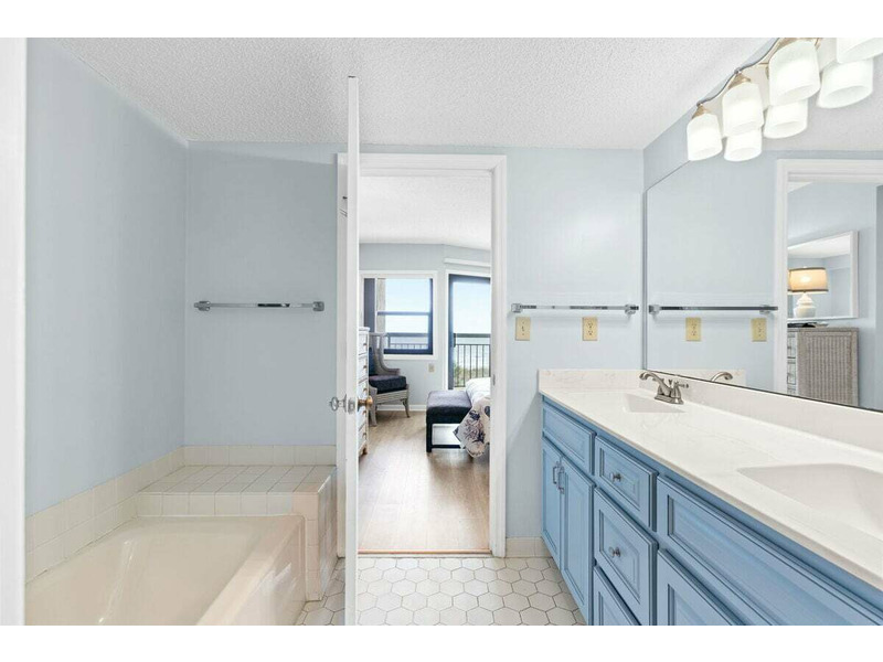 - Primary bedroom with King bed, high back chair, large closet, TV, balcony access, and private bathroom with Jacuzzi tub and standalone, standalone tile shower, and double sinks