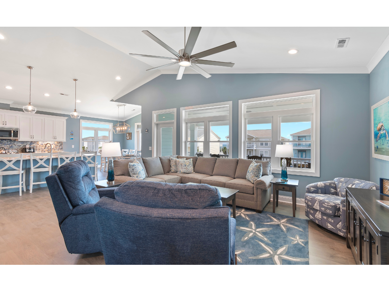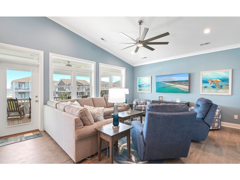 - Primary living space with includes comfortable seating, 65” smart TV, & ceiling fan