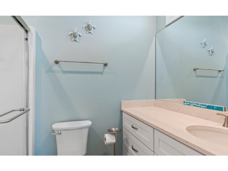 - Bedroom #3 has a set of 2 queen bunk beds (sleeps 8), ceiling fan, smart TV, private bath with a tub shower combo. Closet has a pack and play, high chair and stroller. This is a perfect room for up to 8 children