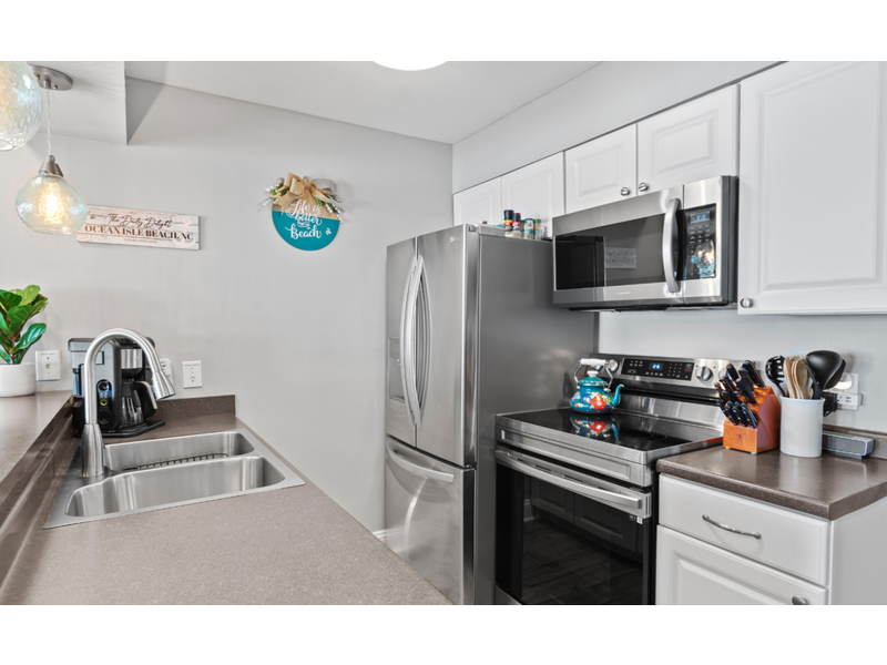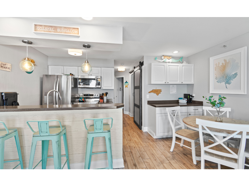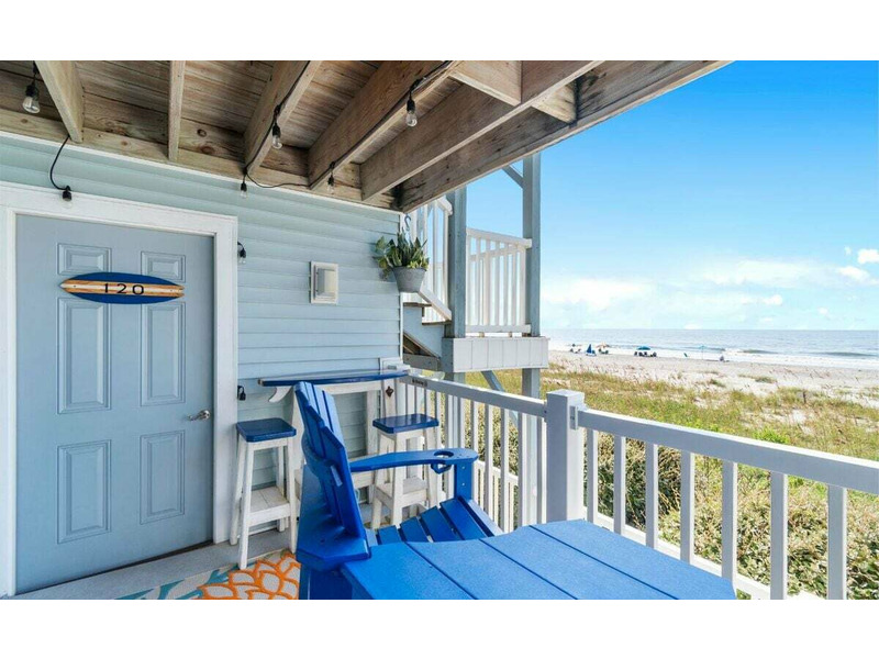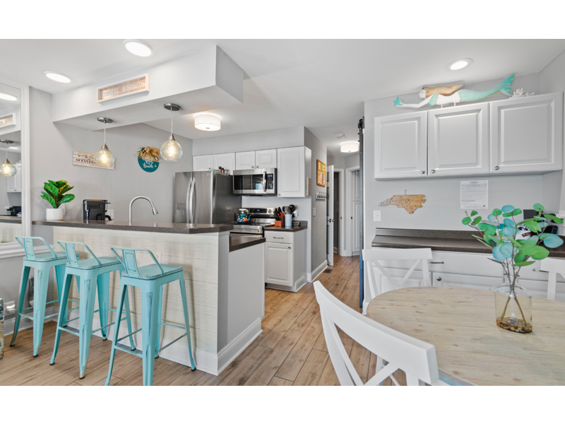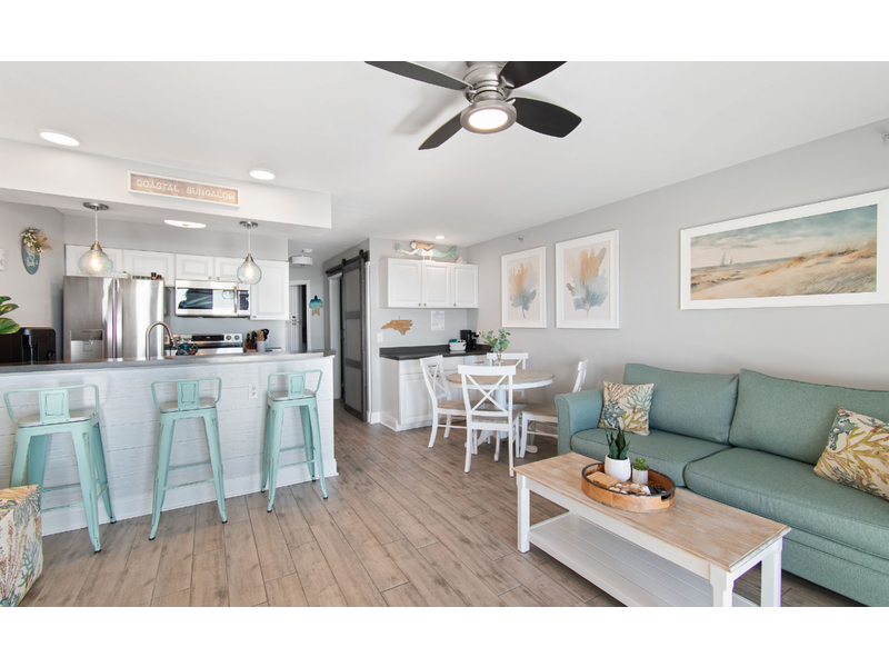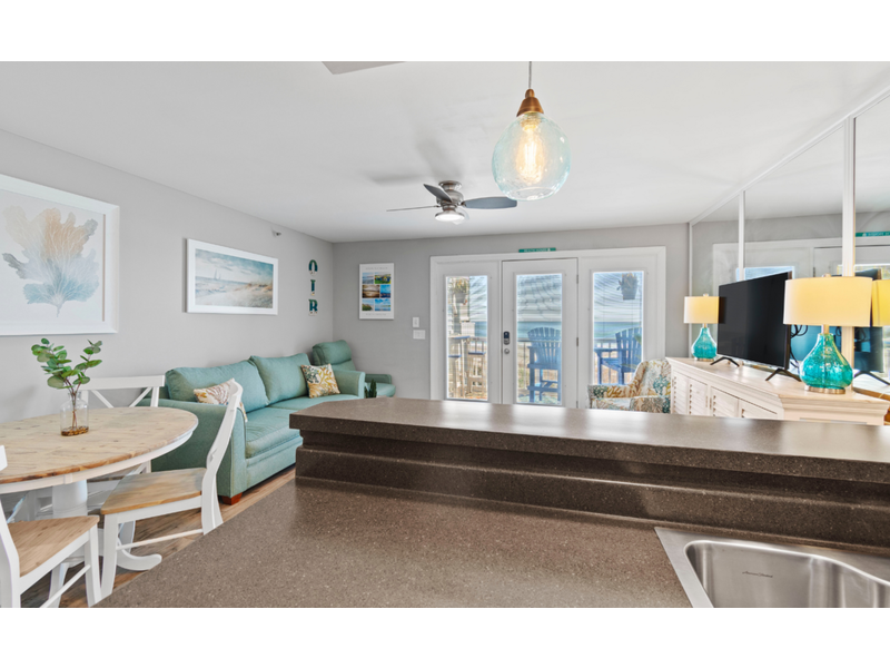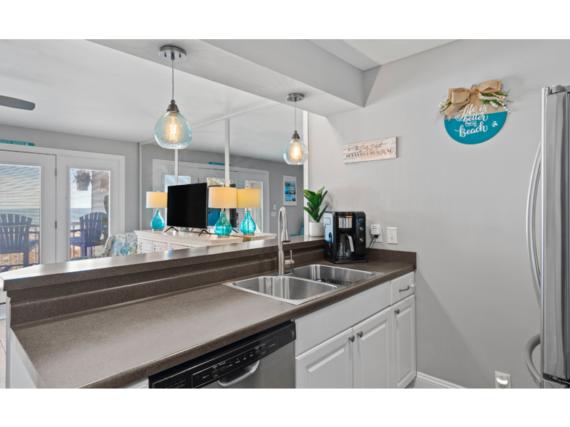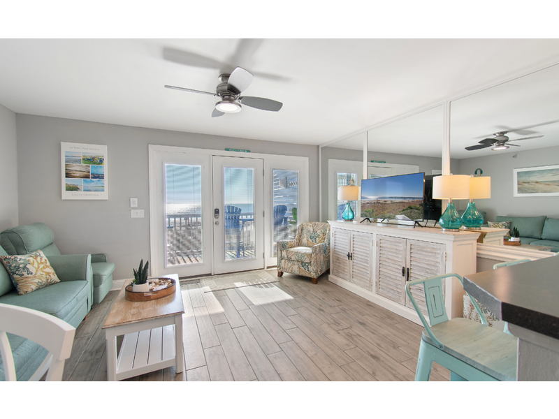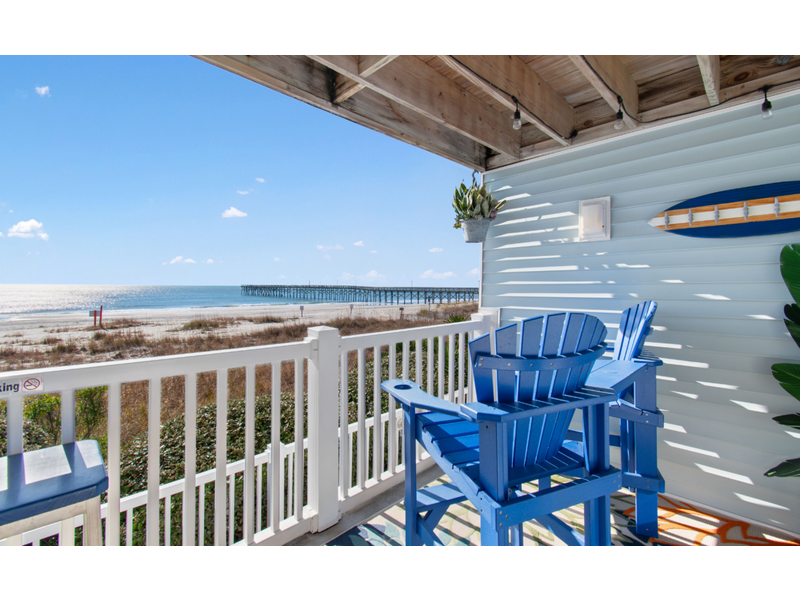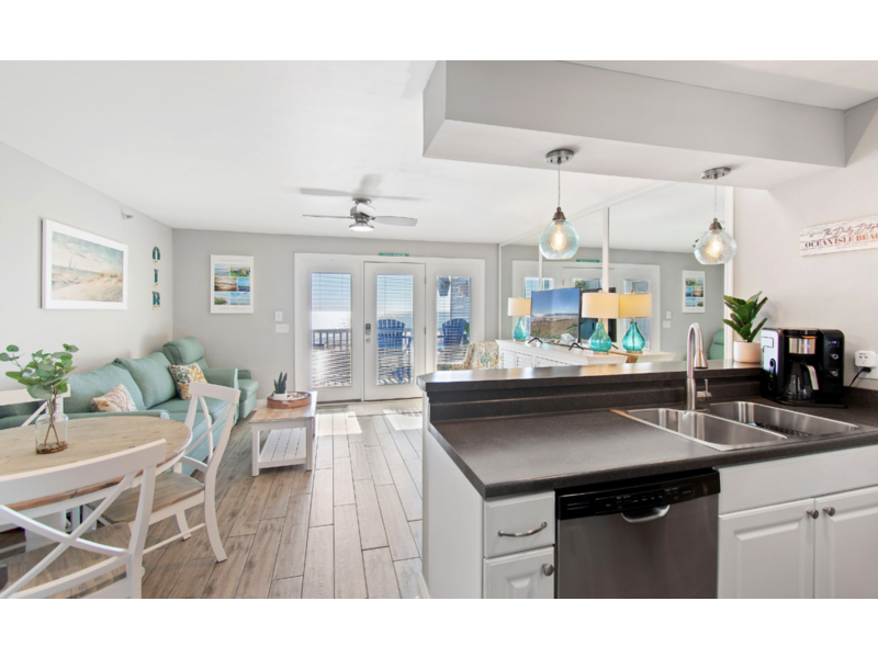 This beautifully remodeled first-floor condo perfectly combines comfort and style. Conveniently located near the handicap ramp, it offers stunning oceanfront views and overlooks the famous Ocean Isle Beach fishing pier. Unwind on your private porch, furnished with cozy captain’s chairs, of an unobstructed view of the ocean and take in breathtaking sunsets after a day of exploring the island. Inside, the fully equipped kitchen provides all the comforts of home, while the tasteful décor creates a warm and inviting atmosphere. Additional amenities include ceiling fans throughout, night lights for added safety, an ultra-high-definition flat-screen SMART TV with streaming capabilities, Wi-Fi, and access to a shared charcoal grill. Guests also have access to a community pool, available from April to October, making it the ideal spot for both relaxation and adventure.  Enjoy this oceanfront beach house just steps from the sand. Drink your coffee in the new kitchen on the deck for bird or dolphin watching.  The balconies off the upstairs bedrooms are great too if you prefer looking at the Intracoastal Waterway.  Yes, there are great views on both sides of the house!  The bright and airy open floor plan includes an updated kitchen, appliances and quartz countertops.  Living room with TV.  Wireless Internet included.  **Bring your own linens and towels for your stay**