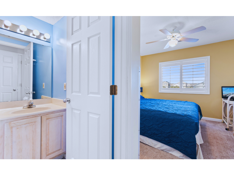 • Primary bedroom with King bed, TV, ceiling fan, and ensuite bathroom with tub/shower combo