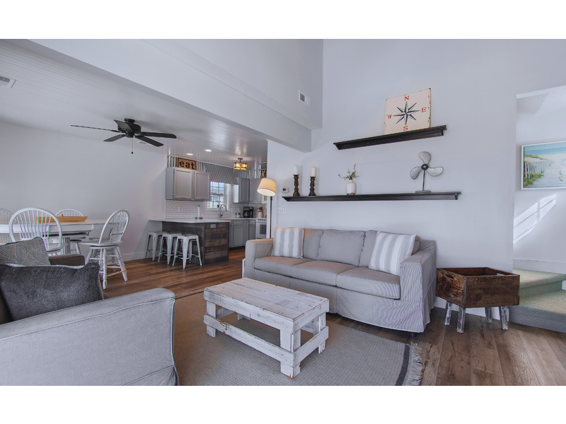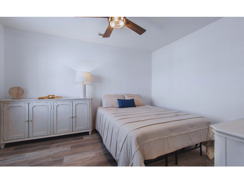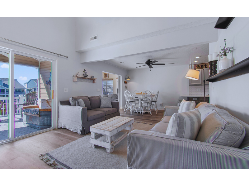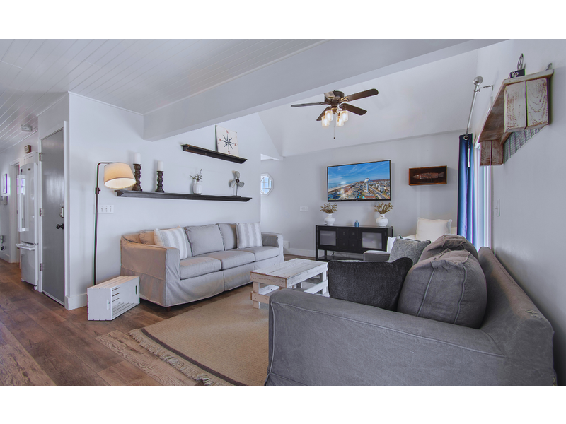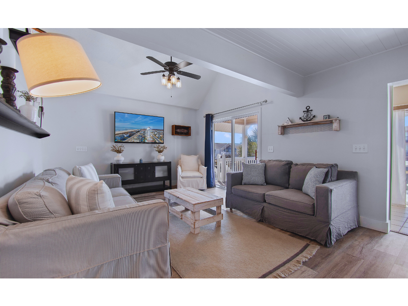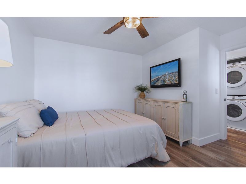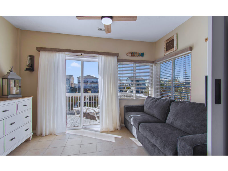 - Street facing bedroom with 1 queen, ceiling fan, TV, sliding glass door to access street facing deck with seating