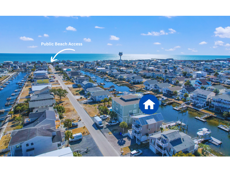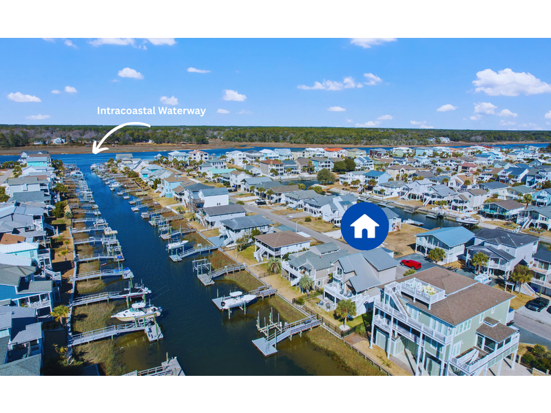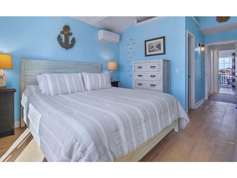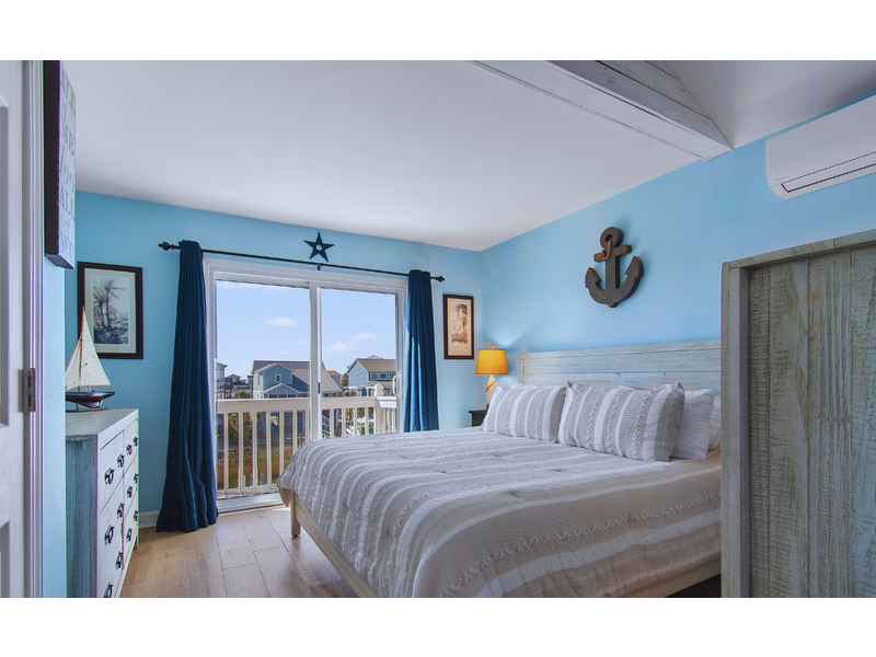 - Primary bedroom overlooking canal on left with 1 king, ceiling fan, TV, large closet, wall mounted mini split AC, sliding glass door leading to small private balcony