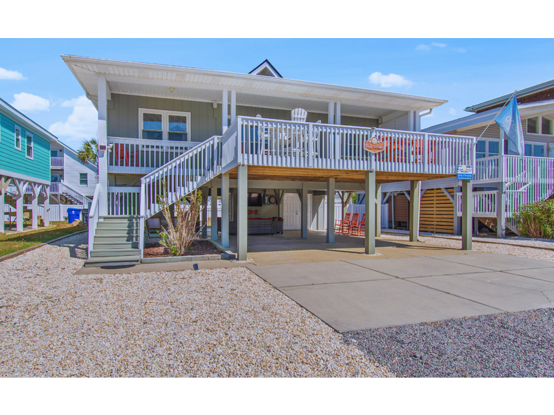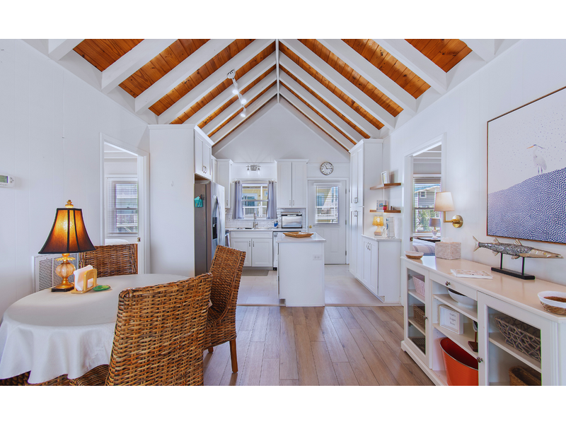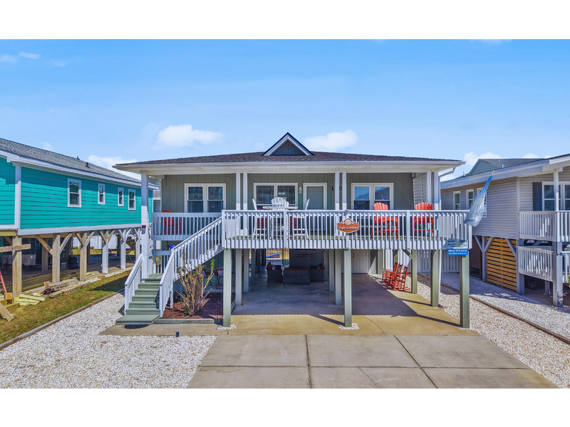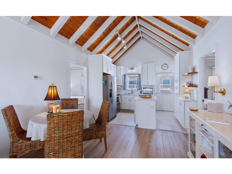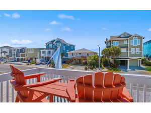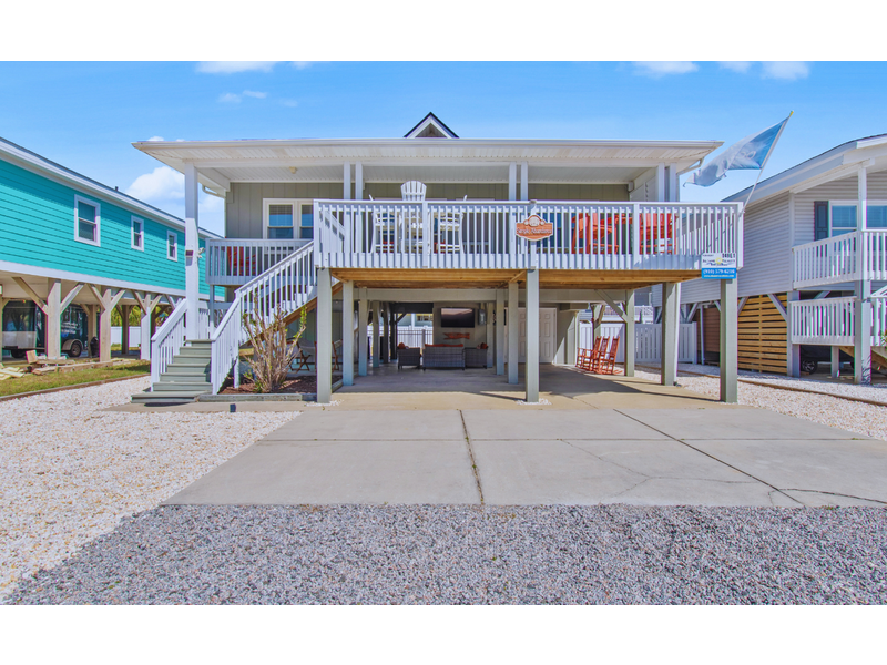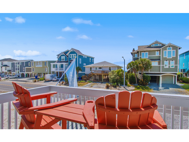 - Street facing partially covered deck with picnic table, rocking chairs, 2 tall Adirondack chairs, bar height table with 4 chairs