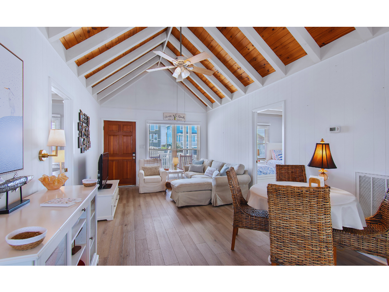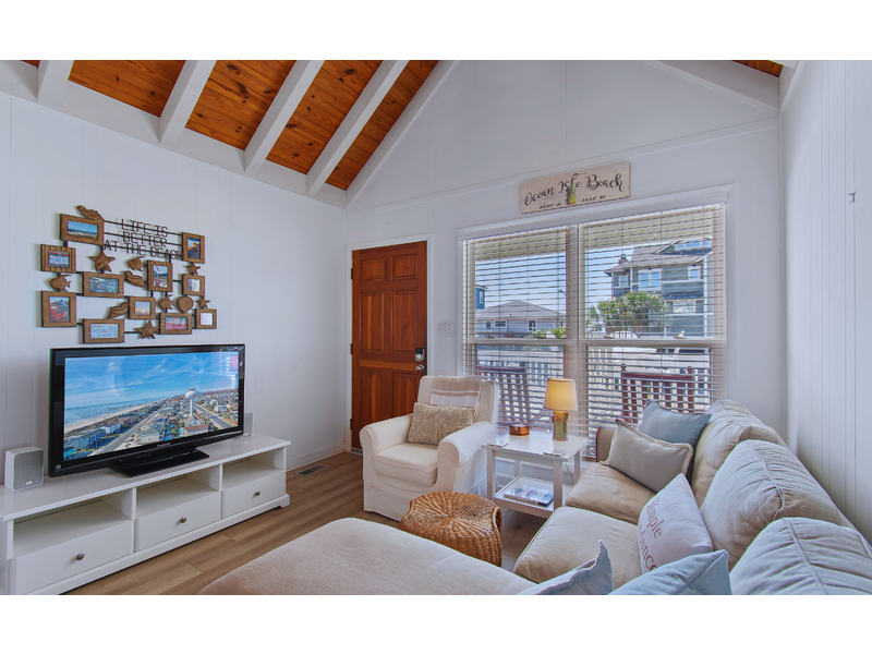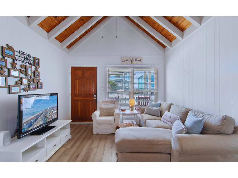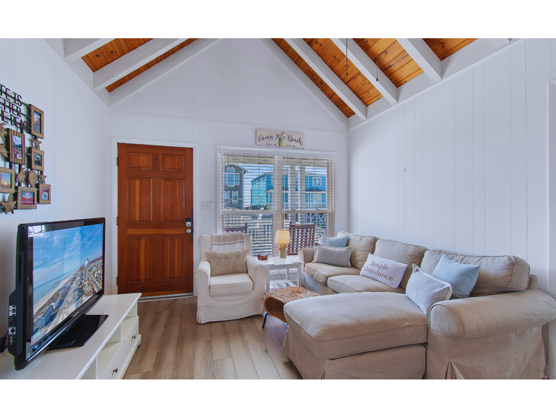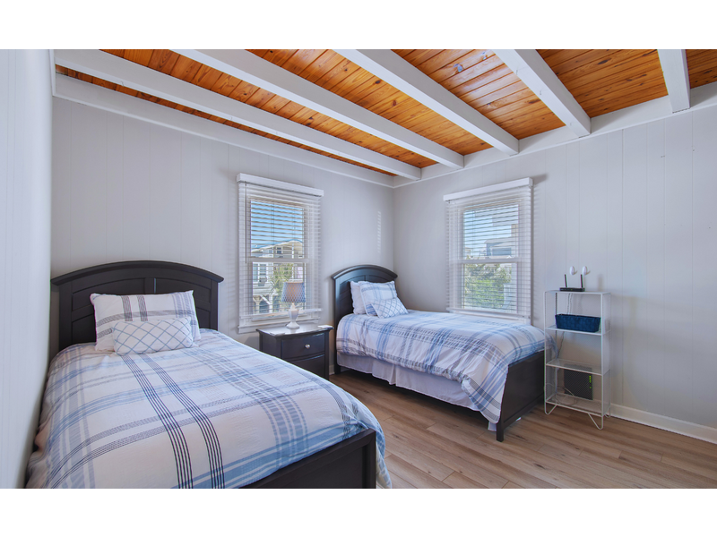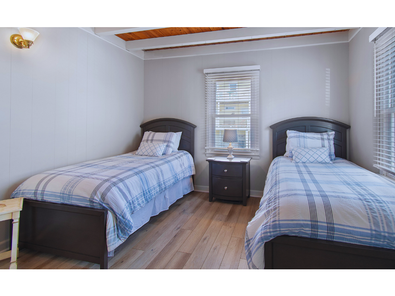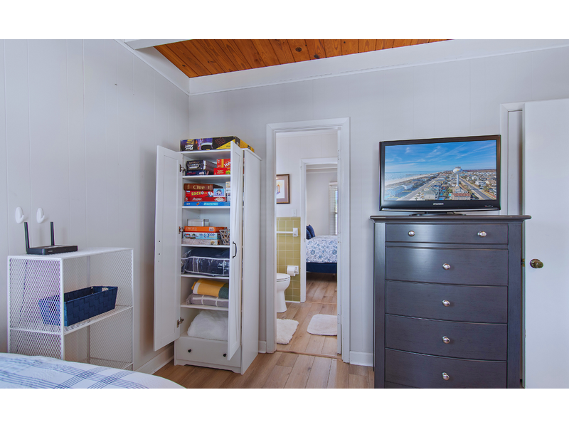 - Back side bedroom with 2 twins, flat screen smart TV with streaming, tall cabinet with board games, puzzles, and playing cards