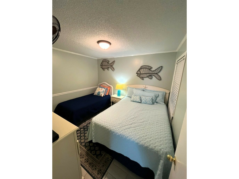 The master bedroom has a queen size bed and a private bathroom with walk-in glass shower. The second bedroom has a queen size bed, as well as a twin bed. There is a full bathroom off of the main hallway with a tub and shower.