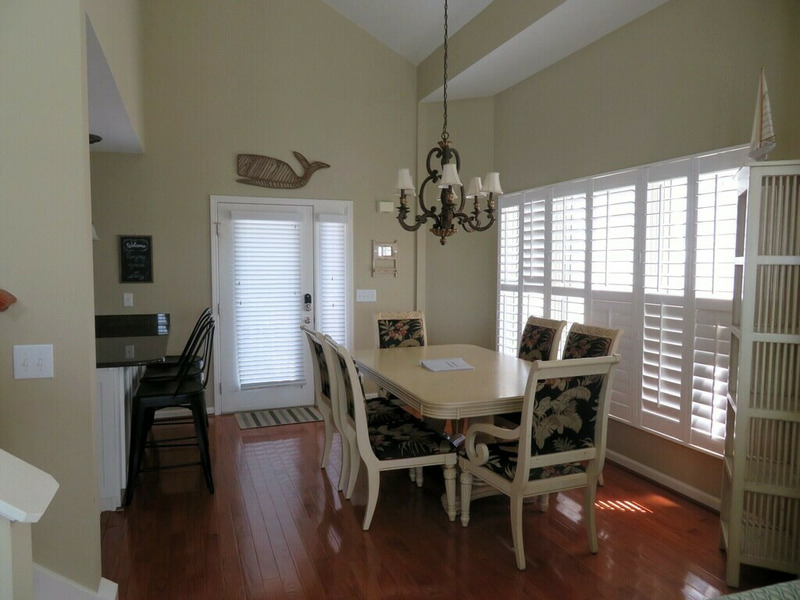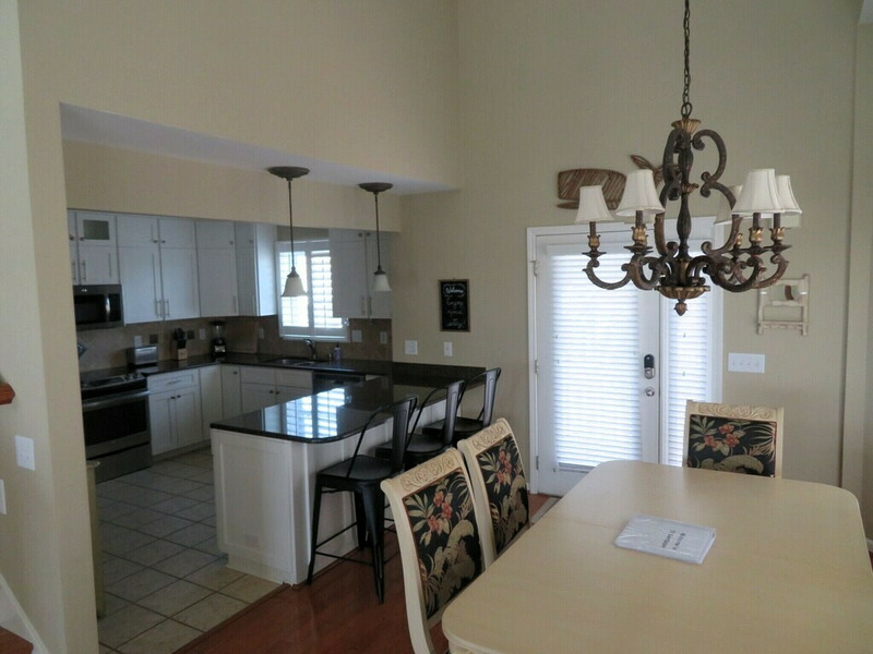 The open living and dining area connects to a fully equipped kitchen with a microwave, dishwasher, blender, and everything needed for easy vacation meals. The dining table seats six, with three additional stools at the kitchen bar, making it easy for everyone to gather for meals or games.