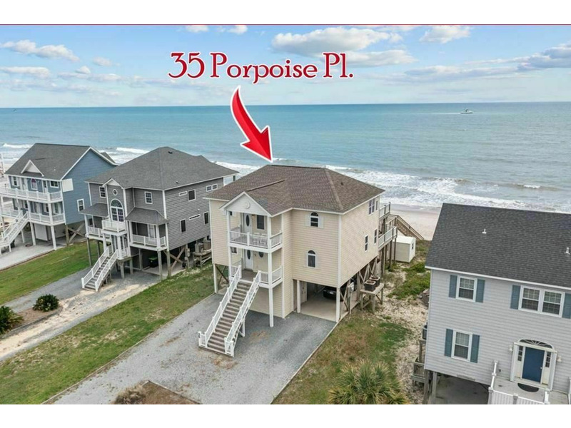 This beautiful 5 bedroom 3.5 bath home sits right on the ocean at 35 Porpoise Place in prestigiousDolphin Shores, which is located on the north end of Topsail Island. It has an elevator, hardwood floors in the living areas, carpeted bedrooms and plenty of deck space.