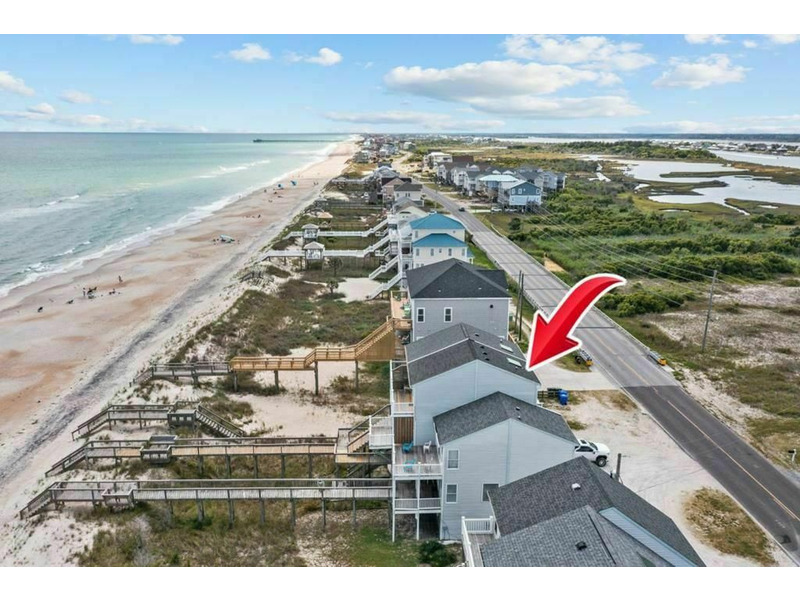 Your entry into the home is through the enclosed garage area, which can prove very convenient on a rainy day. The garage will accommodate one full size vehicle inside, and there is also enough parking outside to accommodate two other vehicles. In the garage you will find a full size washer & dryer conveniently located in an enclosed laundry area. From the garage there is access to a ground level patio on the ocean side, from which there is access directly up and over to the beach or up to the oceanfront balconies and the upper living areas of the home.As you leave the garage area you can take the carpeted stairway up to the first living level. This level has two large bedrooms along with a full bath between them. The ocean side bedroom has a queen bed with a large closet, ceiling fan and flat screen TV. There is a private oceanfront balcony complete with seating just outside the sliding glass doors of this bedroom.