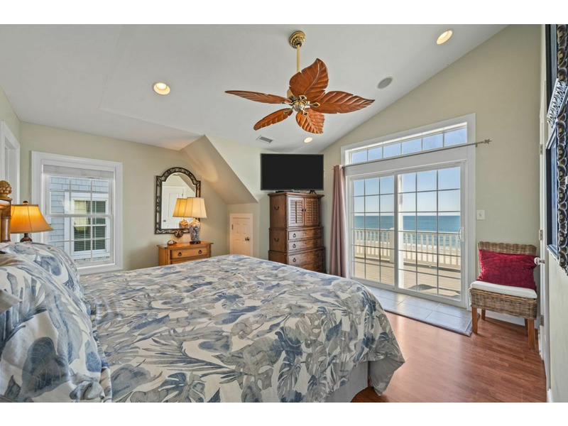 Bedroom 2 -- On the oceanfront side of the house and southern facing, you will find master bedroom 2. This bedroom is equipped with a king bed, ceiling fan, TV and its own private full bath. This bedroom also has direct access out to the oceanfront deck where you will be able to enjoy some of the most magnificent views that Topsail Island has to offer.