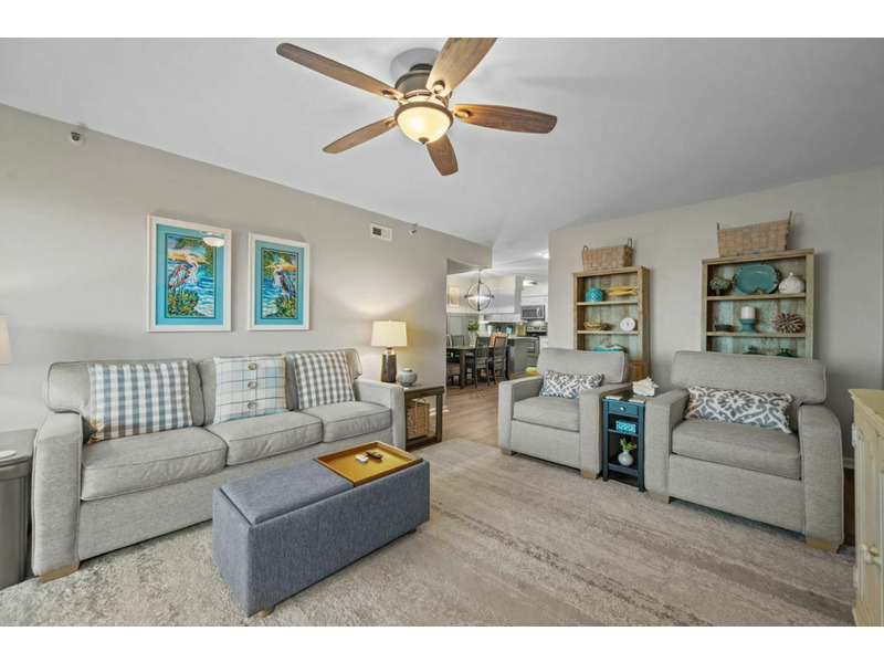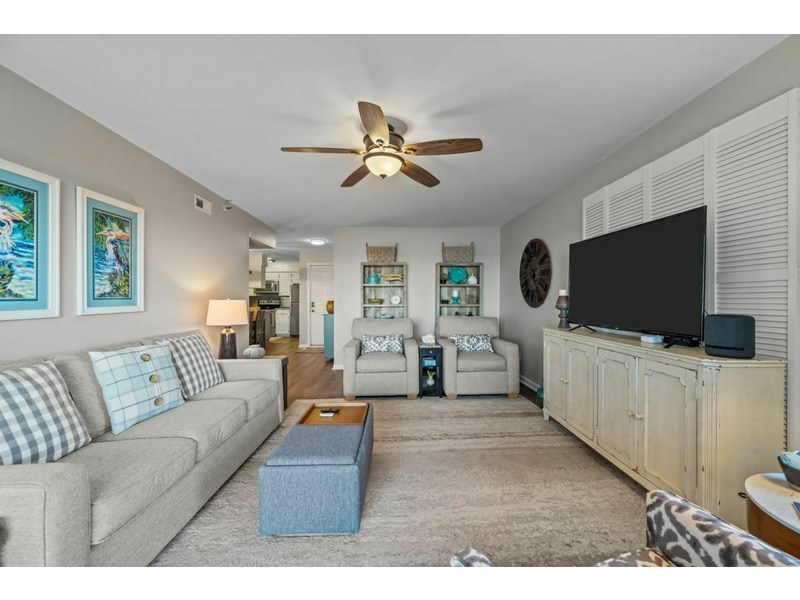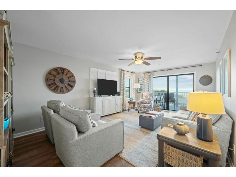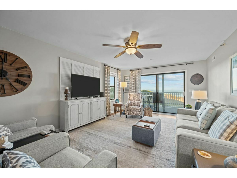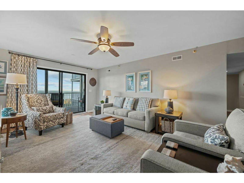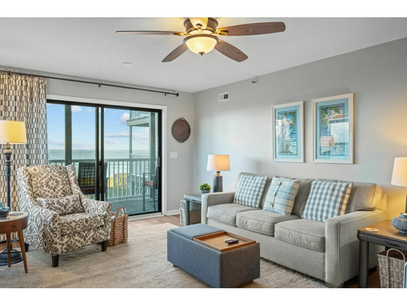 Theliving area is expansive with plenty of comfortable seating for the entire family and it provides direct access out to the oceanfront balcony. The living area also has a queen sleeper sofa to allow for extra guests. There is a large flatscreen TV as well as a ceiling fan, end table and lamps along with a coffee table.