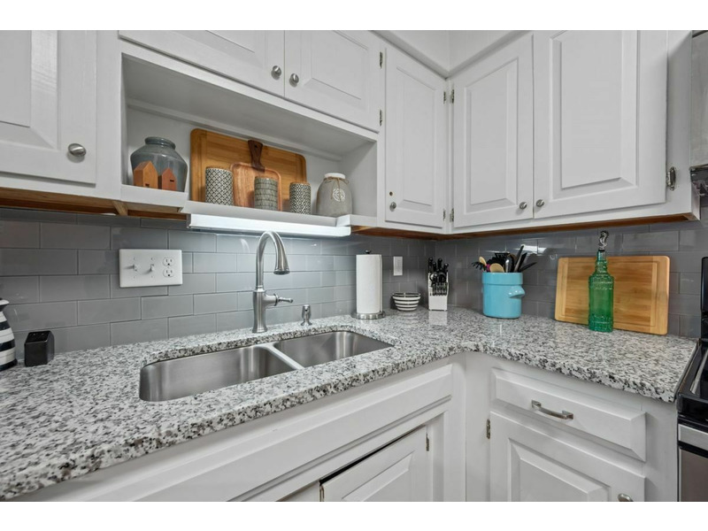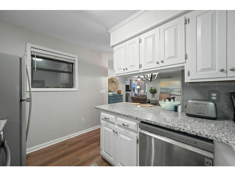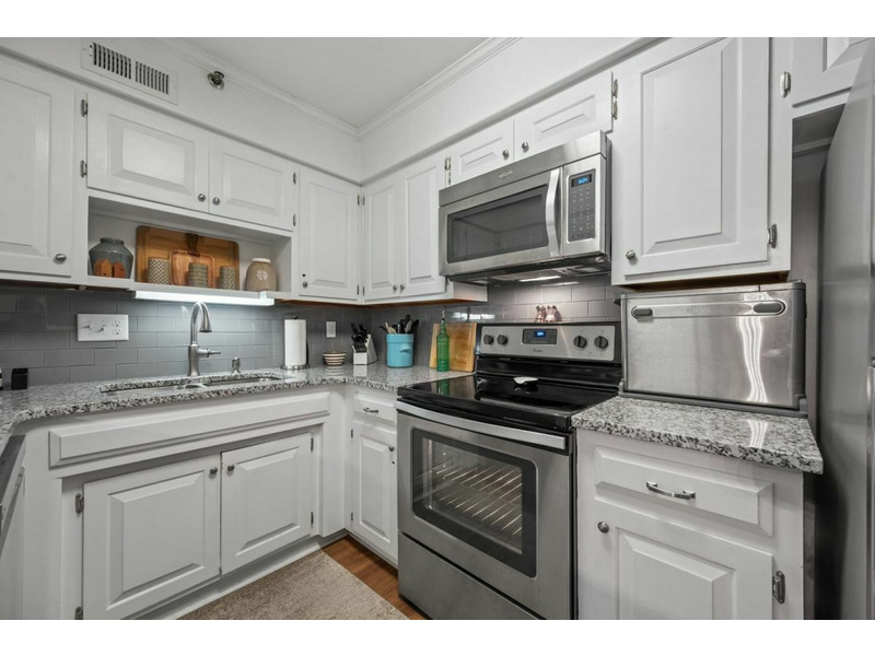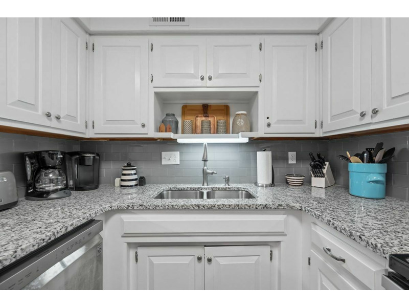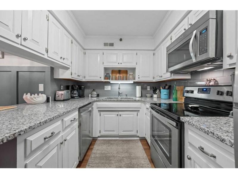 The living area, dining, and kitchen all join to create an open floor plan with lots of usable space. Thekitchen is well equipped with everything needed for basic meal preparations as well as all required major appliances and small countertop appliances. The major appliances are all stainless and include a refrigerator, dishwasher, smooth top range/oven and a built-in microwave. The small countertop appliances include a coffee pot, toaster and blender. There is custom cabinetry, solid surface countertops and subway tile backsplash. There is also a bar area to accommodate additional dining.