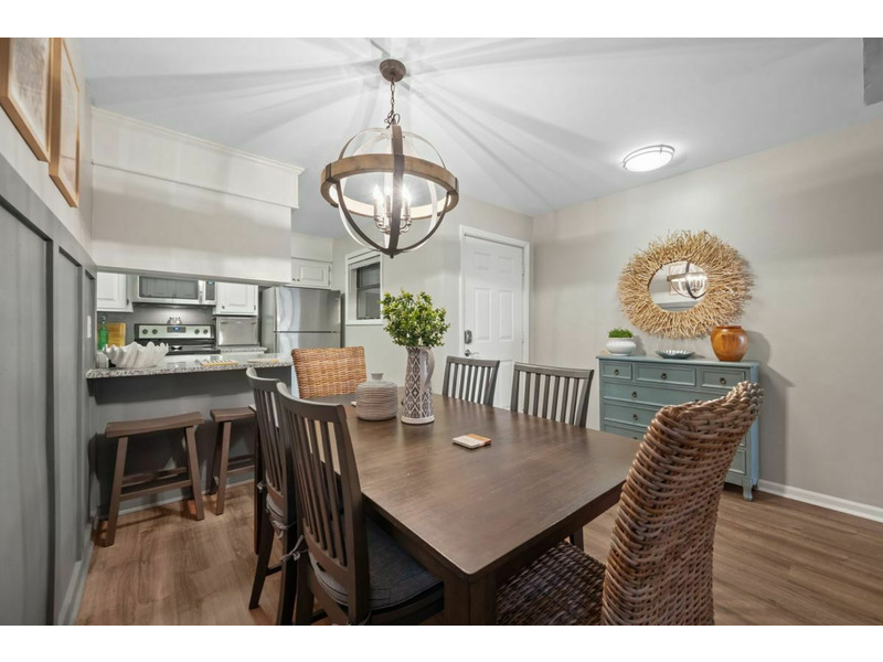Thedining area is adjacent to the kitchen and is equipped to seat 6 at the table and two others at the kitchen bar area.