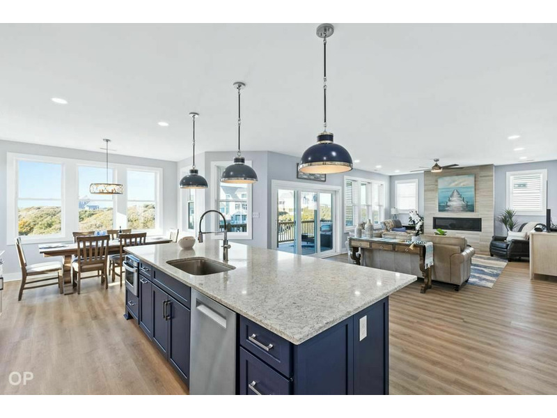 Featuring premium Bosch appliances, a commercial 6 burner gas range, custom cabinetry, solid surface countertops, and stunning blue accents, this kitchen is both a culinary dream and an entertainer's paradise. A cozy living space with HDTV sound system, expansive ocean and sound-facing decks provide the perfect setting for sunrise coffee or sunset cocktails.
