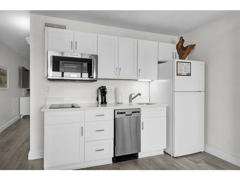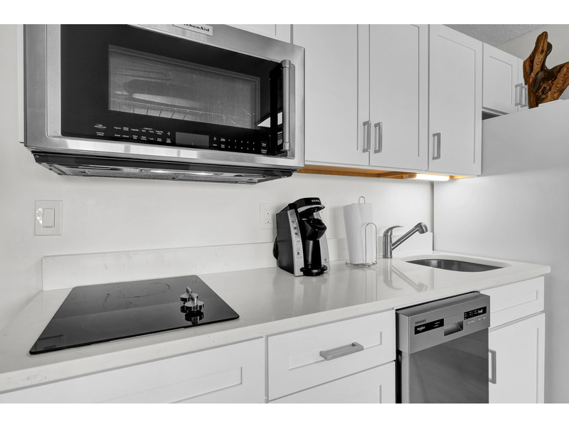 The king-size bed in the bedroom and the Murphy-style queen bed in the living room mean plenty of room to crash after a day of shredding or sunbathing. Two TVs make sure your crew doesn't fight over the remote, and the updated kitchenette is ready for action, with a full fridge, microwave & convection oven, two-burner cooktop, dishwasher, and a Keurig. Pots, pans, and all the basics are included if you're feeling chef-y.