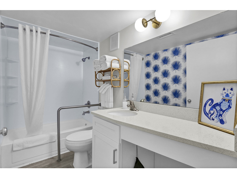 Relax in Style: The bathroom features a variety of bath amenities and a tub/shower combo with a grab bar for added safety.