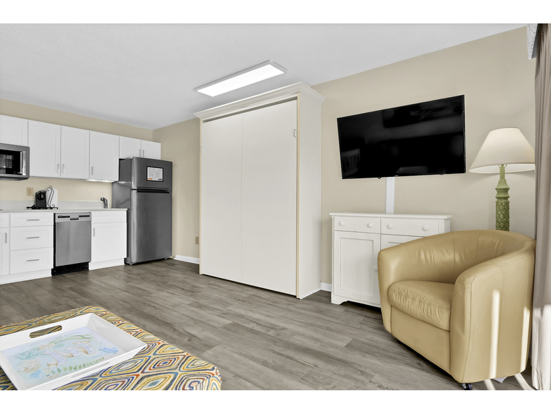 The king-size bed in the bedroom and the Murphy-style queen bed in the living room mean plenty of room to crash after a day of shredding or sunbathing. Two TVs make sure your crew doesn't fight over the remote, and the updated kitchenette is ready for action, with a full fridge, microwave & convection oven, two-burner cooktop, dishwasher, Keurig, and even an ice maker to keep your drinks chill. Pots, pans, and all the basics are included if you're feeling chef-y.