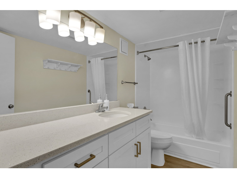 Relax in Style: The bathroom features a variety of bath amenities and a tub/shower combo with a grab bar for added safety.
