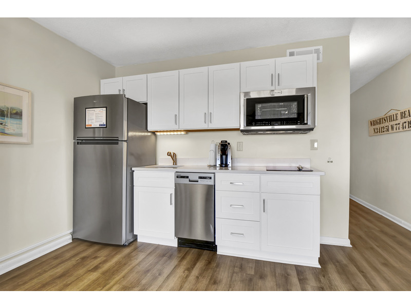 The king-size bed in the bedroom and the Murphy-style queen bed in the living room mean plenty of room to crash after a day of shredding or sunbathing. Two TVs make sure your crew doesn't fight over the remote, and the updated kitchenette is ready for action, with a full fridge, microwave & convection oven, two-burner cooktop, dishwasher, Keurig, and even an ice maker to keep your drinks chill. Pots, pans, and all the basics are included if you're feeling chef-y.