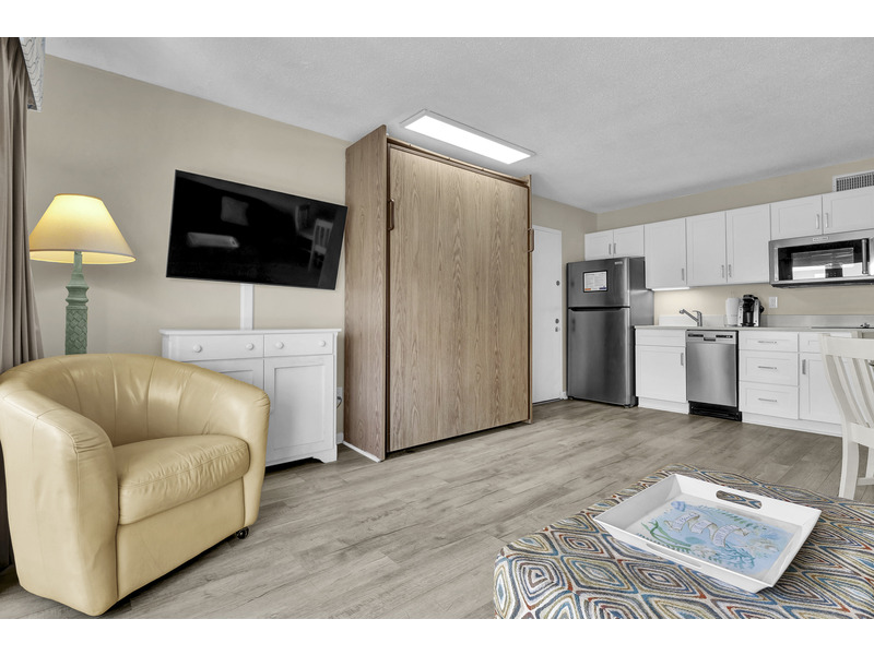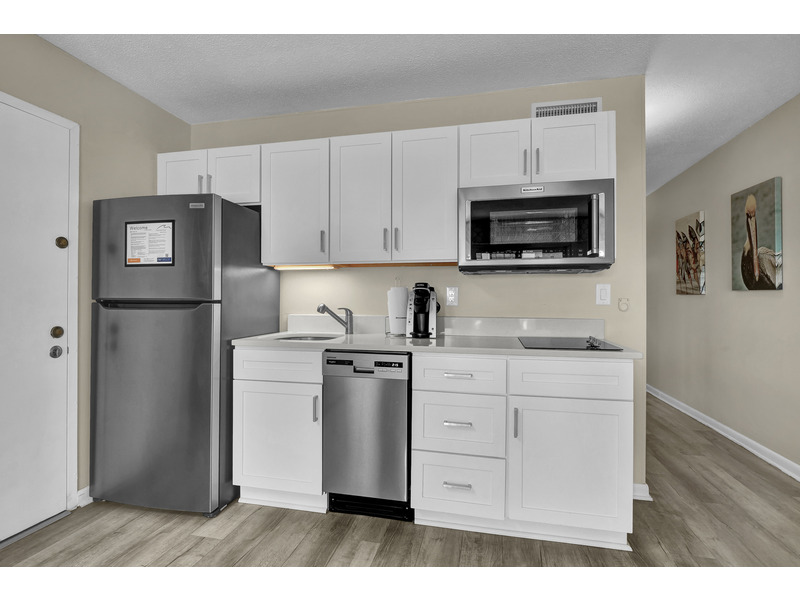 The king-size bed in the bedroom and the Murphy-style queen bed in the living room mean plenty of room to crash after a day of shredding or sunbathing. Two TVs make sure your crew doesn't fight over the remote, and the updated kitchenette is ready for action, with a full fridge, microwave & convection oven, two-burner cooktop, dishwasher, Keurig, and even an ice maker to keep your drinks chill. Pots, pans, and all the basics are included if you're feeling chef-y.