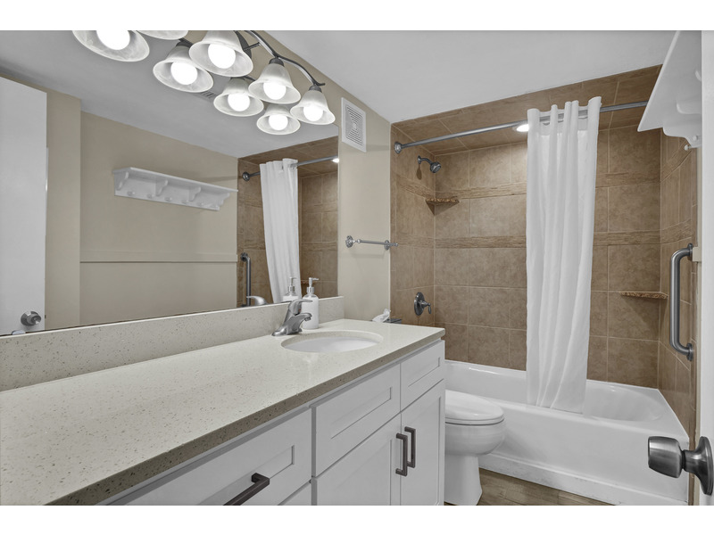 Relax in Style: The bathroom features a variety of bath amenities and a tub/shower combo with a grab bar for added safety.