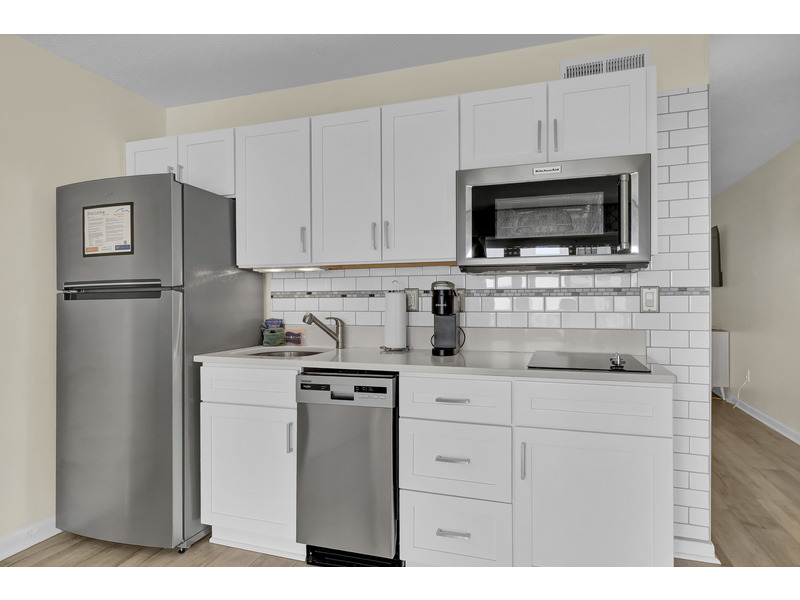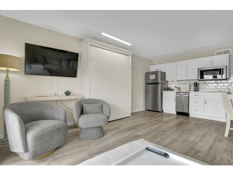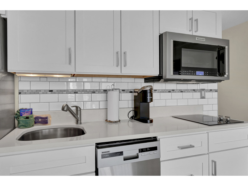 The king-size bed in the bedroom and the Murphy-style queen bed in the living room mean plenty of room to crash after a day of shredding or sunbathing. Two TVs make sure your crew doesn't fight over the remote, and the updated kitchenette is ready for action, with a full fridge, microwave & convection oven, two-burner cooktop, dishwasher, Keurig, and even an ice maker to keep your drinks chill. Pots, pans, and all the basics are included if you're feeling chef-y.